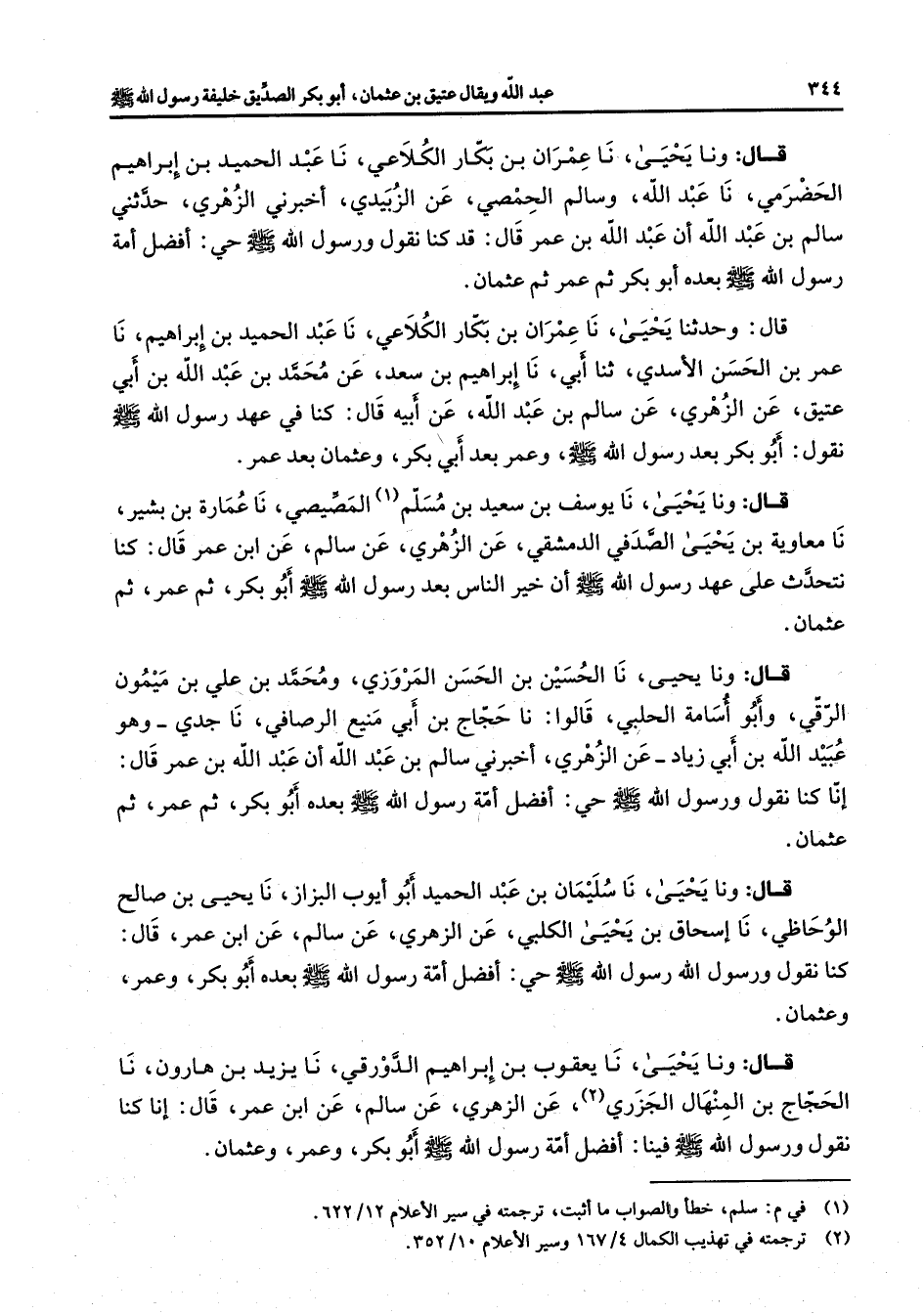 قال ونا يحيى نا عمران بن بكار الكلاعي نا عبد الحميد بن إبراهيم الحضرمي نا عبد الله وسالم الحمصي عن الزبيدي أخبرني الزهري حدثني سالم بن عبد الله أن عبد الله بن عمر قال قد كنا نقول ورسول الله (صلى الله عليه وسلم) حي أفضل أمة رسول الله (صلى الله عليه وسلم) بعده أبو بكر ثم عمر ثم عثمان قال وحدثنا يحيى نا عمران بن بكار الكلاعي نا عبد الحميد بن إبراهيم نا عمر بن الحسن الأسدي ثنا أبي نا إبراهيم بن سعد عن محمد بن عبد الله بن أبي عتيق عن الزهري عن سالم بن عبد الله عن أبيه قال كنا في عهد رسول الله (صلى الله عليه وسلم) نقول أبو بكر بعد رسول الله (صلى الله عليه وسلم) وعمر بعد أبي بكر وعثمان بعد عمر قال ونا يحيى نا يوسف بن سعيد بن مسلم (1) المصيصي نا عمارة بن بشير نا معاوية بن يحيى الصدفي الدمشقي عن الزهري عن سالم عن ابن عمر قال كنا نتحدث على عهد رسول الله (صلى الله عليه وسلم) أن خير الناس بعد رسول الله (صلى الله عليه وسلم) أبو بكر ثم عمر ثم عثمان قال ونا يحيى نا الحسين بن الحسن المروزي ومحمد بن علي بن ميمون الرقي وأبو أسامة الحلبي قالوا نا حجاج بن أبي منيع الرصافي نا جدي وهو عبيد الله بن أبي زياد عن الزهري أخبرني سالم بن عبد الله أن عبد الله بن عمر قال إنا كنا نقول ورسول الله (صلى الله عليه وسلم) حي أفضل أمة رسول الله (صلى الله عليه وسلم) بعده أبو بكر ثم عمر ثم عثمان قال ونا يحيى نا سليمان بن عبد الحميد أبو أيوب البزاز نا يحيى بن صالح الوحاظي نا إسحاق بن يحيى الكلبي عن الزهري عن سالم عن ابن عمر قال كنا نقول ورسول الله رسول الله (صلى الله عليه وسلم) حي أفضل أمة رسول الله (صلى الله عليه وسلم) بعده أبو بكر وعمر وعثمان قال ونا يحيى نا يعقوب بن إبراهيم الدورقي نا يزيد بن هارون نا الحجاج بن المنهال الجزري (2) عن الزهري عن سالم عن ابن عمر قال إنا كنا نقول ورسول الله (صلى الله عليه وسلم) فينا أفضل أمة رسول الله (صلى الله عليه وسلم) أبو بكر وعمر وعثمان