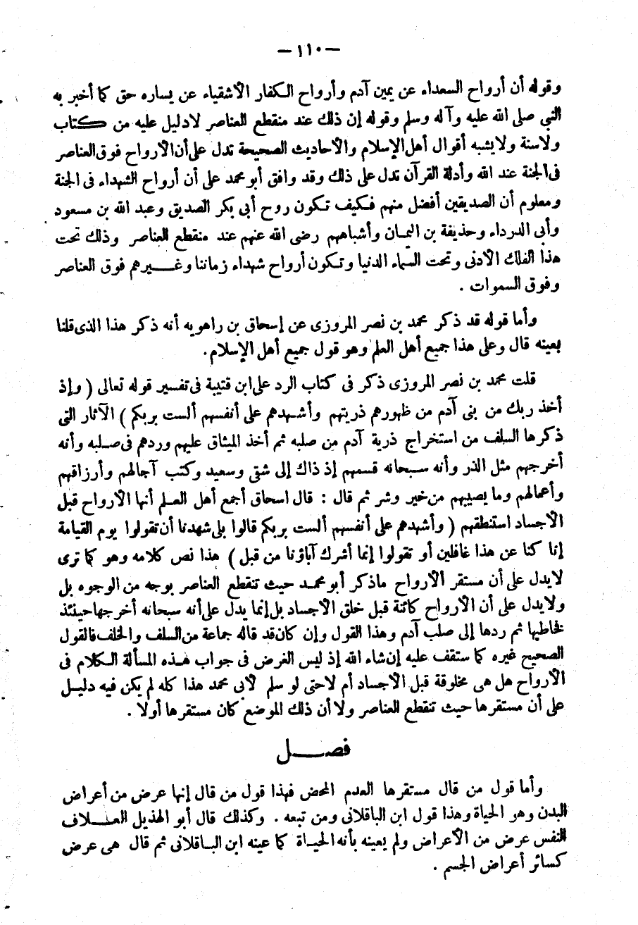 قلت مُحَمَّد بن نصر المروزى ذكر فِي كتاب الرَّد على ابْن قُتَيْبَة فِي تَفْسِير قَوْله تَعَالَى {وَإِذ أَخذ رَبك من بني آدم من ظُهُورهمْ ذُرِّيتهمْ وأشهدهم على أنفسهم أَلَسْت بربكم} الْآثَار الَّتِي ذكرهَا السّلف من اسْتِخْرَاج ذُرِّيَّة آدم من صلبه ثمَّ أَخذ الْمِيثَاق عَلَيْهِم وردهم فِي صلبه وَأَنه أخرجهم مثل الذَّر وَأَنه سُبْحَانَهُ قسمهم إِذْ ذَاك إِلَى شقي وَسَعِيد وَكتب آجالهم وأرزاقهم وأعمالهم وَمَا يصيبهم من خير وَشر ثمَّ قَالَ قَالَ إِسْحَاق أجمع أهل الْعلم أَنَّهَا الْأَرْوَاح قبل الأجساد استنطقهم {وأشهدهم على أنفسهم أَلَسْت بربكم قَالُوا بلَى شَهِدنَا أَن تَقولُوا يَوْم الْقِيَامَة إِنَّا كُنَّا عَن هَذَا غافلين أَو تَقولُوا إِنَّمَا أشرك آبَاؤُنَا من قبل} هَذَا نَص كَلَامه وَهُوَ كَمَا ترى لَا يدل على أَن مُسْتَقر الْأَرْوَاح مَا ذكر أَبُو مُحَمَّد حَيْثُ تَنْقَطِع العناصر بِوَجْه من الْوُجُوه بل وَلَا يدل على أَن الْأَرْوَاح كائنة قبل خلق الأجساد بل إِنَّمَا يدل على أَنه سُبْحَانَهُ أخرجهَا حِينَئِذٍ فخاطبها ثمَّ ردهَا إِلَى صلب آدم وَهَذَا القَوْل وَإِن كَانَ قد قَالَه جمَاعَة من السّلف وَالْخلف فَالْقَوْل الصَّحِيح غَيره كَمَا ستقف عَلَيْهِ إِن شَاءَ الله إِذْ لَيْسَ الْغَرَض فِي جَوَاب هَذِه الْمَسْأَلَة الْكَلَام فِي الْأَرْوَاح هَل هِيَ مخلوقة قبل الأجساد أم لَا حَتَّى لَو سلم لأبى مُحَمَّد هَذَا كُله لم يكن فِيهِ دَلِيل على أَن مستقرها حَيْثُ تَنْقَطِع العناصر وَلَا أَن ذَلِك الْموضع كَانَ مستقرها أَولا