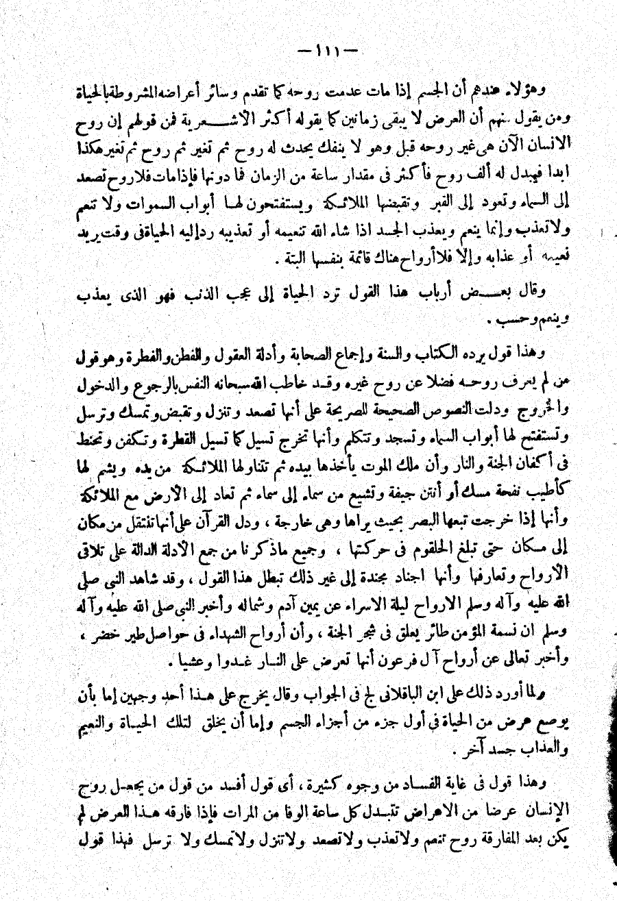 وَهَؤُلَاء عِنْدهم أَن الْجِسْم إِذا مَاتَ عدمت روحه كَمَا تقدم وَسَائِر أعراضه الْمَشْرُوطَة بِالْحَيَاةِ وَمن يَقُول مِنْهُم أَن الْعرض لَا يبْقى زمانين كَمَا يَقُوله أَكثر الأشعرية فَمن قَوْلهم إِن روح الْإِنْسَان الْآن هِيَ غير روحه قبل وَهُوَ لَا يَنْفَكّ يحدث لَهُ روح ثمَّ تغير ثمَّ روح ثمَّ تغير هَكَذَا أبدا فيبدل لَهُ ألف روح فَأكْثر فِي مِقْدَار سَاعَة من الزَّمَان فَمَا دونهَا فَإِذا مَاتَ فَلَا روح تصعد إِلَى السَّمَاء وتعود إِلَى الْقَبْر وتقبضها الْمَلَائِكَة ويستفتحون لَهَا أَبْوَاب السَّمَوَات وَلَا تنعم وَلَا تعذب وَإِنَّمَا ينعم ويعذب الْجَسَد إِذا شَاءَ الله تنعيمه أَو تعذيبه رد إِلَيْهِ الْحَيَاة فِي وَقت يُرِيد نعيمه أَو عَذَابه وَإِلَّا فَلَا أَرْوَاح هُنَاكَ قَائِمَة بِنَفسِهَا الْبَتَّةَ