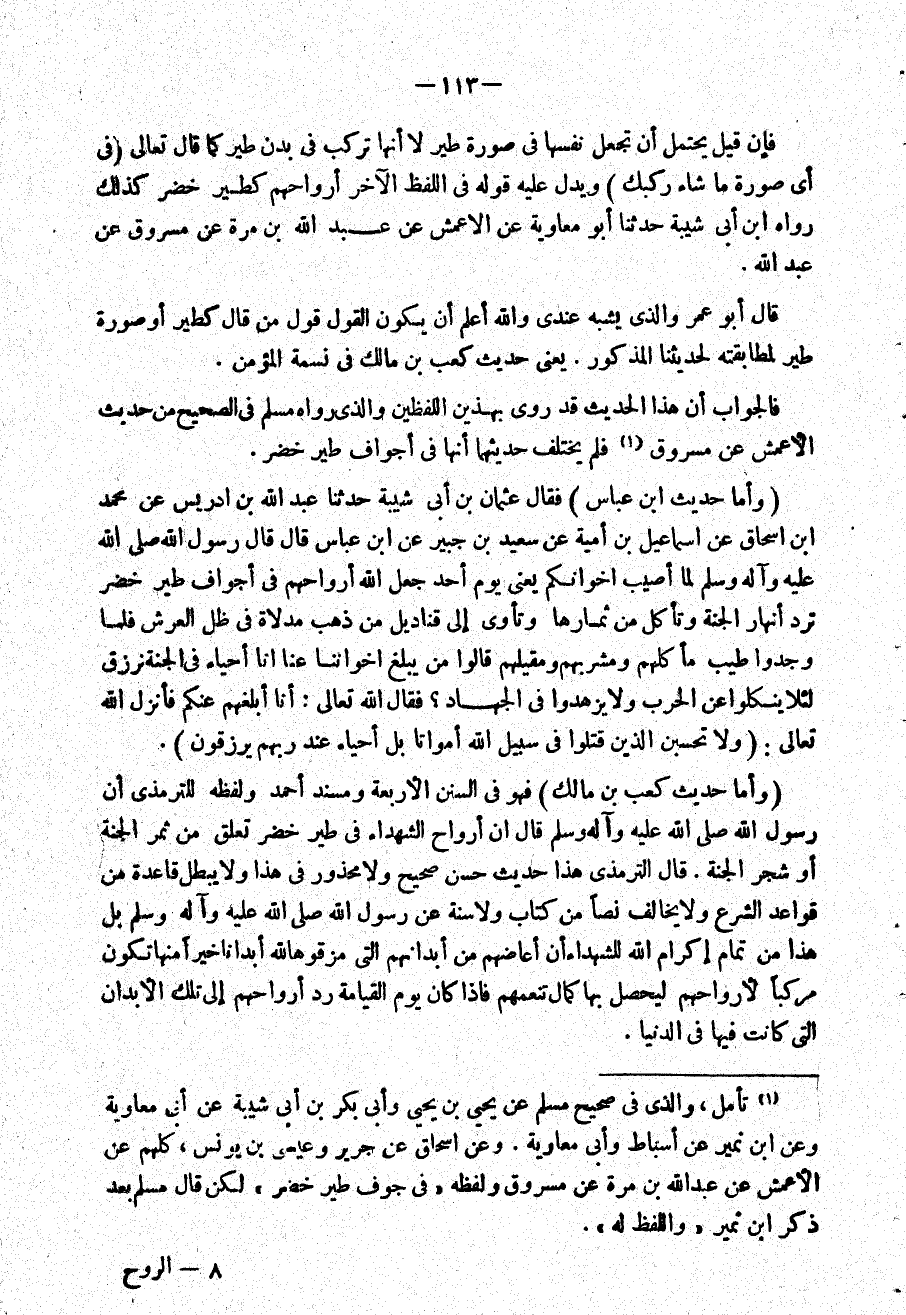 وَأما حَدِيث كَعْب بن مَالك فَهُوَ فِي السّنَن الْأَرْبَعَة ومسند أَحْمد وَلَفظه لِلتِّرْمِذِي أَن رَسُول الله قَالَ إِن أَرْوَاح الشُّهَدَاء فِي طير خضر تعلق من ثَمَر الْجنَّة أَو شجر الْجنَّة قَالَ الترمذى هَذَا حَدِيث حسن صَحِيح وَلَا مَحْذُور فِي هَذَا وَلَا يبطل قَاعِدَة من قَوَاعِد الشَّرْع وَلَا يُخَالف نصا من كتاب وَلَا سنة عَن رَسُول الله بل هَذَا من تَمام إكرام الله للشهداء أَن أعاضهم من أبدانهم الَّتِي مزقوها لله أبدانا خيرا مِنْهَا تكون مركبا لأرواحهم ليحصل بهَا كَمَال تنعمهم فَإِذا كَانَ يَوْم الْقِيَامَة رد أَرْوَاحهم إِلَى تِلْكَ الْأَبدَان الَّتِي كَانَت فِيهَا فِي الدُّنْيَا