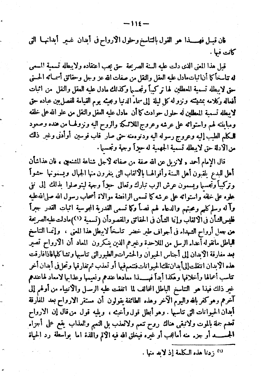 قَالَ الإِمَام أَحْمد لَا نزيل عَن الله صفة من صِفَاته لأجل شناعة المشنعين فان هَذَا شَأْن أهل الْبدع يلقبون أهل السّنة وأقوالها بِالْأَلْقَابِ الَّتِي ينفرون مِنْهُ الْجُهَّال ويسمونها حَشْوًا وتركيبا وتجسيما ويسمون عرش الرب تبَارك وَتَعَالَى حيزا وجهة ليتوصلوا بذلك إِلَى نفي علوه على خلقه واستوائه على عَرْشه كَمَا تسمى الرافضة مُوالَاة أَصْحَاب رَسُول الله كلهم ومحبتهم وَالدُّعَاء لَهُم نصا وكما تسمى الْقَدَرِيَّة الْمَجُوسِيَّة إِثْبَات الْقدر جبرا فَلَيْسَ الشَّأْن فِي الألقاب وَإِنَّمَا الشَّأْن فِي الْحَقَائِق وَالْمَقْصُود أَن تَسْمِيَة مَا دلّت عَلَيْهِ الصَّرِيحَة من جعل أَرْوَاح الشُّهَدَاء فِي أَجْوَاف طير خضر تناسخا لَا يبطل هَذَا الْمَعْنى وَإِنَّمَا التناسخ الْبَاطِل مَا تَقوله أَعدَاء الرُّسُل من الْمَلَاحِدَة وَغَيرهم الَّذين يُنكرُونَ الْمعَاد أَن الْأَرْوَاح تصير بعد مُفَارقَة الْأَبدَان إِلَى أَجنَاس الْحَيَوَان والحشرات والطيور الَّتِي تناسبها وتشاكلها فَإِذا فَارَقت هَذِه الْأَبدَان انْتَقَلت إِلَى أبدان تِلْكَ الْحَيَوَانَات فتنعم فِيهَا أَو تعذب ثمَّ تفارقها وَتحل فِي أبدان أخر تناسب أَعمالهَا وأخلاقها وَهَكَذَا أبدا فَهَذَا معادها عِنْدهم وَنَعِيمهَا وعذابها لَا معاد لَهَا عِنْدهم غير ذَلِك فَهَذَا هُوَ التناسخ الْبَاطِل الْمُخَالف لما اتّفقت عَلَيْهِ الرُّسُل والأنبياء من أَوَّلهمْ إِلَى آخِرهم وَهُوَ كفر بِاللَّه وَالْيَوْم الآخر وَهَذِه الطَّائِفَة يَقُولُونَ أَن مُسْتَقر الْأَرْوَاح بعد الْمُفَارقَة أبدان الْحَيَوَانَات الَّتِي تناسبها وَهُوَ ابطل قَول وأخبثه ويليه قَول من قَالَ إِن الْأَرْوَاح تعدم جملَة بِالْمَوْتِ وَلَا تبقى هُنَاكَ روح تنعم وَلَا تعذب بل النَّعيم وَالْعَذَاب يَقع على أَجزَاء الْجَسَد أَو جُزْء مِنْهُ أما عجب أَو غَيره فيخلق الله فِيهِ الْأَلَم واللذة أما بِوَاسِطَة رد الْحَيَاة