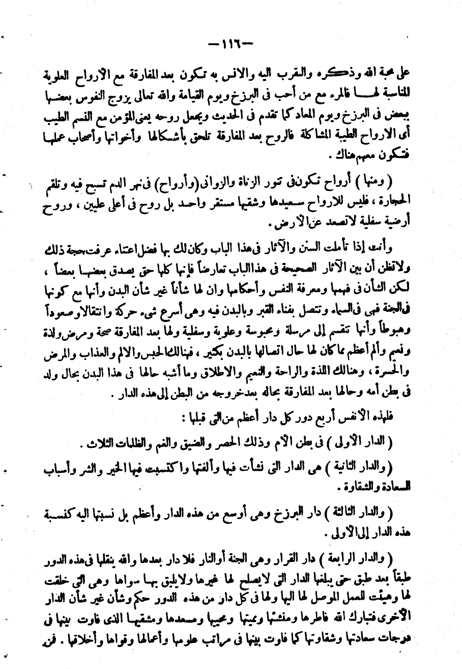وَأَنت إِذا تَأَمَّلت السّنَن والْآثَار فِي هَذَا الْبَاب وَكَانَ لَك بهَا فضل اعتناء عرفت حجَّة ذَلِك وَلَا تظن أَن بَين الْآثَار الصَّحِيحَة فِي هَذَا الْبَاب تَعَارضا فَإِنَّهَا كلهَا حق يصدق بَعْضهَا بَعْضًا لَكِن الشَّأْن فِي فهمها وَمَعْرِفَة النَّفس وأحكامها وان لَهَا شانا غير شَأْن الْبدن وَأَنَّهَا مَعَ كَونهَا فِي الْجنَّة فَهِيَ فِي السَّمَاء وتتصل بِفنَاء الْقَبْر وبالبدن فِيهِ وَهِي أسْرع شَيْء حَرَكَة وانتقالا وصعودا وهبوطا وَأَنَّهَا تَنْقَسِم إِلَى مُرْسلَة ومحبوسة وعلوية وسفلية وَلها بعد الْمُفَارقَة صِحَة وَمرض وَلَذَّة ونعيم والم أعظم مِمَّا كَانَ لَهَا حَال اتصالها بِالْبدنِ بِكَثِير فهنالك الْحَبْس والألم وَالْعَذَاب وَالْمَرَض وَالْحَسْرَة وهنالك اللَّذَّة والراحة وَالنَّعِيم وَالْإِطْلَاق وَمَا أشبه حَالهَا فِي هَذَا الْبدن بِحَال ولد فِي بطن أمه وحالها بعد الْمُفَارقَة بِحَالهِ بعد خُرُوجه من الْبَطن إِلَى هَذِه الدَّار