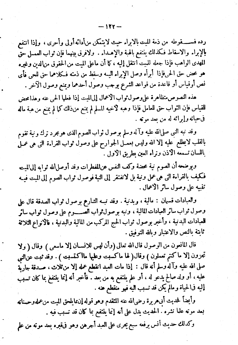 رده فسقوطه من ذمَّة الْمَيِّت بالابراء حَيْثُ لَا يتَمَكَّن من أَدَائِهِ أولى وَأَحْرَى وَإِذا انْتفع بِالْإِبْرَاءِ والإسقاط فَكَذَلِك ينْتَفع بِالْهبةِ والإهداء وَلَا فرق بَينهمَا فَإِن ثَوَاب الْعَمَل حق المهدى الْوَاهِب فَإِذا جعله للْمَيت انْتقل إِلَيْهِ كَمَا أَن مَا على الْمَيِّت من الْحُقُوق من الدّين وَغَيره هُوَ مَحْض حق الْحَيّ فَإِذا أَبرَأَهُ وصل الْإِبْرَاء إِلَيْهِ وَسقط من ذمَّته فكلاهما حق للحى فَأَي نَص أَو قِيَاس أَو قَاعِدَة من قَوَاعِد الشَّرْع يُوجب وُصُول أَحدهمَا وَيمْنَع وُصُول الآخر