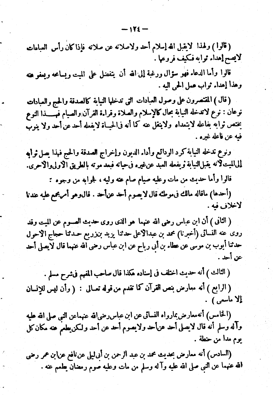 قَالُوا وَلِهَذَا لَا يقبل الله إِسْلَام أحد وَلَا صلَاته عَن صلَاته فَإِذا كَانَ رَأس الْعِبَادَات لَا يَصح إهداء ثَوَابه فَكيف فروعها