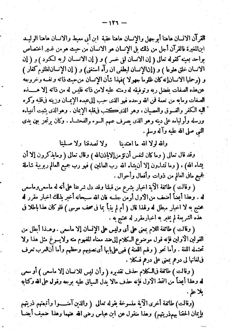 الْقُرْآن الْإِنْسَان هَا هُنَا أَبُو جهل وَالْإِنْسَان هَا هُنَا عقبَة ابْن أَبى معيط وَالْإِنْسَان هَاهُنَا الْوَلِيد ابْن الْمُغيرَة فالقرآن أجل من ذَلِك بل الْإِنْسَان هُوَ الْإِنْسَان من حَيْثُ هُوَ من غير اخْتِصَاص بِوَاحِد بِعَيْنِه كَقَوْلِه تَعَالَى {إِن الْإِنْسَان لفي خسر} و {إِن الْإِنْسَان لرَبه لكنود} و {إِن الْإِنْسَان خلق هلوعا} و {إِن الْإِنْسَان ليطْغى أَن رَآهُ اسْتغنى} و {إِن الْإِنْسَان لظلوم كفار} و {وَحملهَا الْإِنْسَان إِنَّه كَانَ ظلوما جهولا} فَهَذَا شَأْن الْإِنْسَان من حَيْثُ ذَاته وَنَفسه وَخُرُوجه عَن هَذِه الصِّفَات بِفضل ربه وتوفيقه لَهُ ومنته عَلَيْهِ لَا من ذَاته فَلَيْسَ لَهُ من ذَاته إِلَّا هَذِه الصِّفَات وَمَا بِهِ من نعْمَة فَمن الله وَحده فَهُوَ الذى حبب إِلَى عَبده الْإِيمَان وزينه فِي قلبه وَكره إِلَيْهِ الْكفْر والفسوق والعصيان وَهُوَ الَّذِي كتب فِي قلبه الْإِيمَان وَهُوَ الَّذِي يثبت أنبياءه وَرُسُله وأولياءه على دينه وَهُوَ الَّذِي يصرف عَنْهُم السوء والفحشاء وَكَانَ يرتجز بَين يَدي النَّبِي