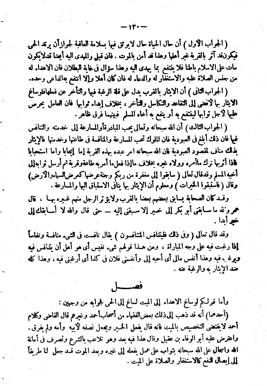 فصل وَأما قَوْلكُم لَو سَاغَ الإهداء إِلَى الْمَيِّت لساغ إِلَى الْحَيّ فَجَوَابه من وَجْهَيْن