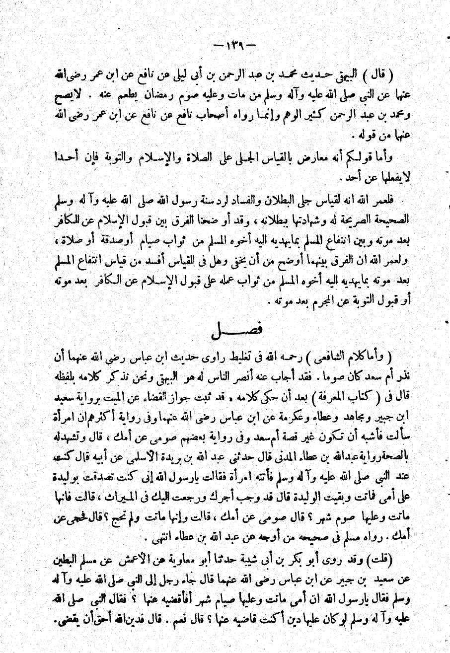 فلعمر الله انه لقياس جلى الْبطلَان وَالْفساد لرد سنة رَسُول الله الصَّحِيحَة الصَّرِيحَة لَهُ وشهادتها بِبُطْلَانِهِ وَقد أوضحنا الْفرق بَين قبُول الْإِسْلَام عَن الْكَافِر بعد مَوته وَبَين انْتِفَاع الْمُسلم بِمَا يهديه إِلَيْهِ أَخُوهُ الْمُسلم من ثَوَاب صِيَام أَو صَدَقَة أَو صَلَاة ولعمر الله إِن الْفرق بَينهمَا أوضح من أَن يخفي وَهل فِي الْقيَاس أفسد من قِيَاس انْتِفَاع الْمُسلم بعد مَوته بِمَا يهديه إِلَيْهِ أَخُوهُ الْمُسلم من ثَوَاب عمله على قبُول الْإِسْلَام عَن الْكَافِر بعد مَوته أَو قبُول التَّوْبَة عَن المجرم بعد مَوته
