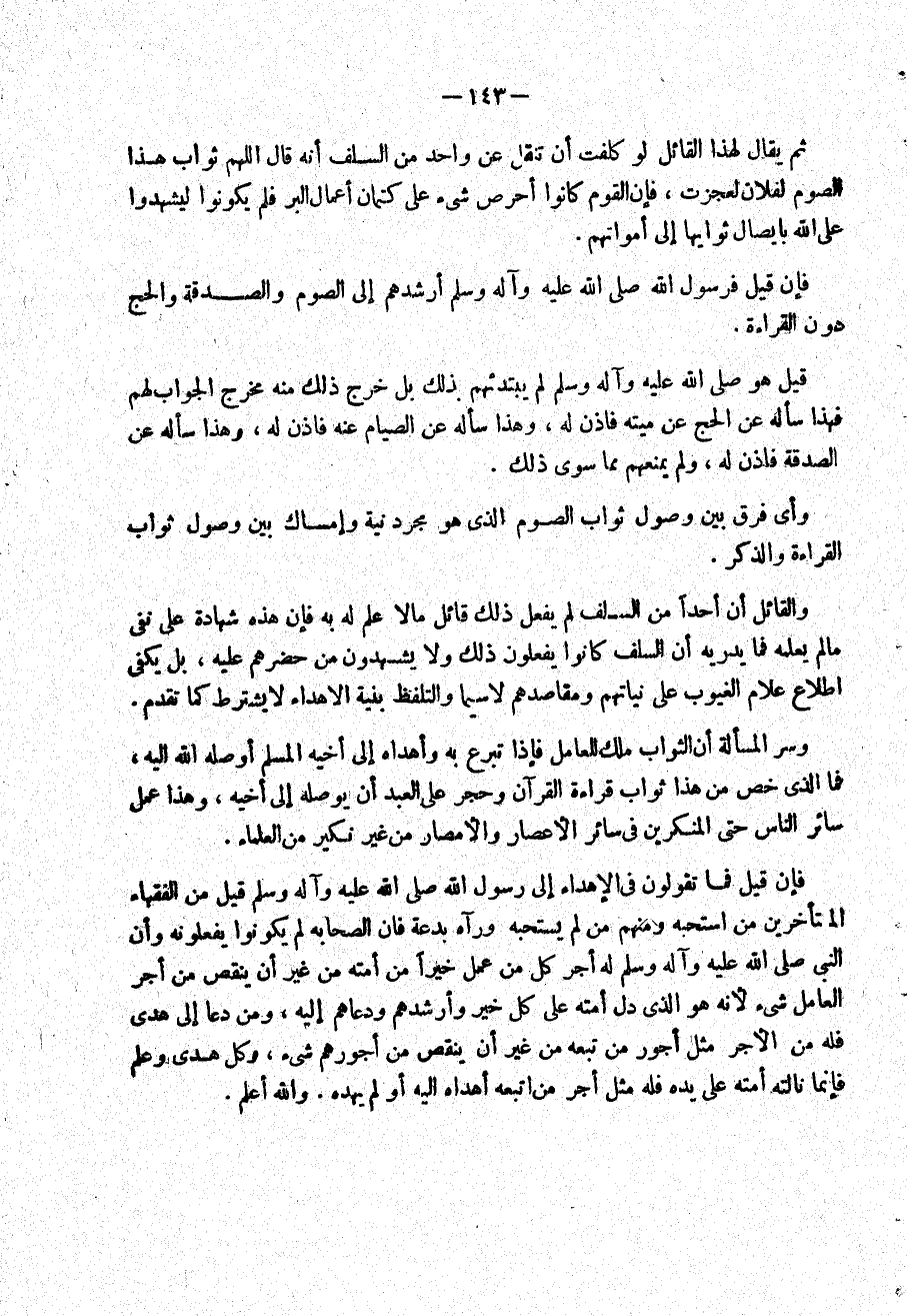 وَالْقَائِل أَن أحدا من السّلف لم يفعل ذَلِك قَائِل مَالا علم لَهُ بِهِ فَإِن هَذِه شَهَادَة على نفي مَا لم يعمله فَمَا يدريه أَن السّلف كَانُوا يَفْعَلُونَ ذَلِك وَلَا يشْهدُونَ من حضرهم عَلَيْهِ بل يَكْفِي اطلَاع علام الغيوب على نياتهم ومقاصدهم لَا سِيمَا والتلفظ بنية الإهداء لَا يشْتَرط كَمَا تقدم