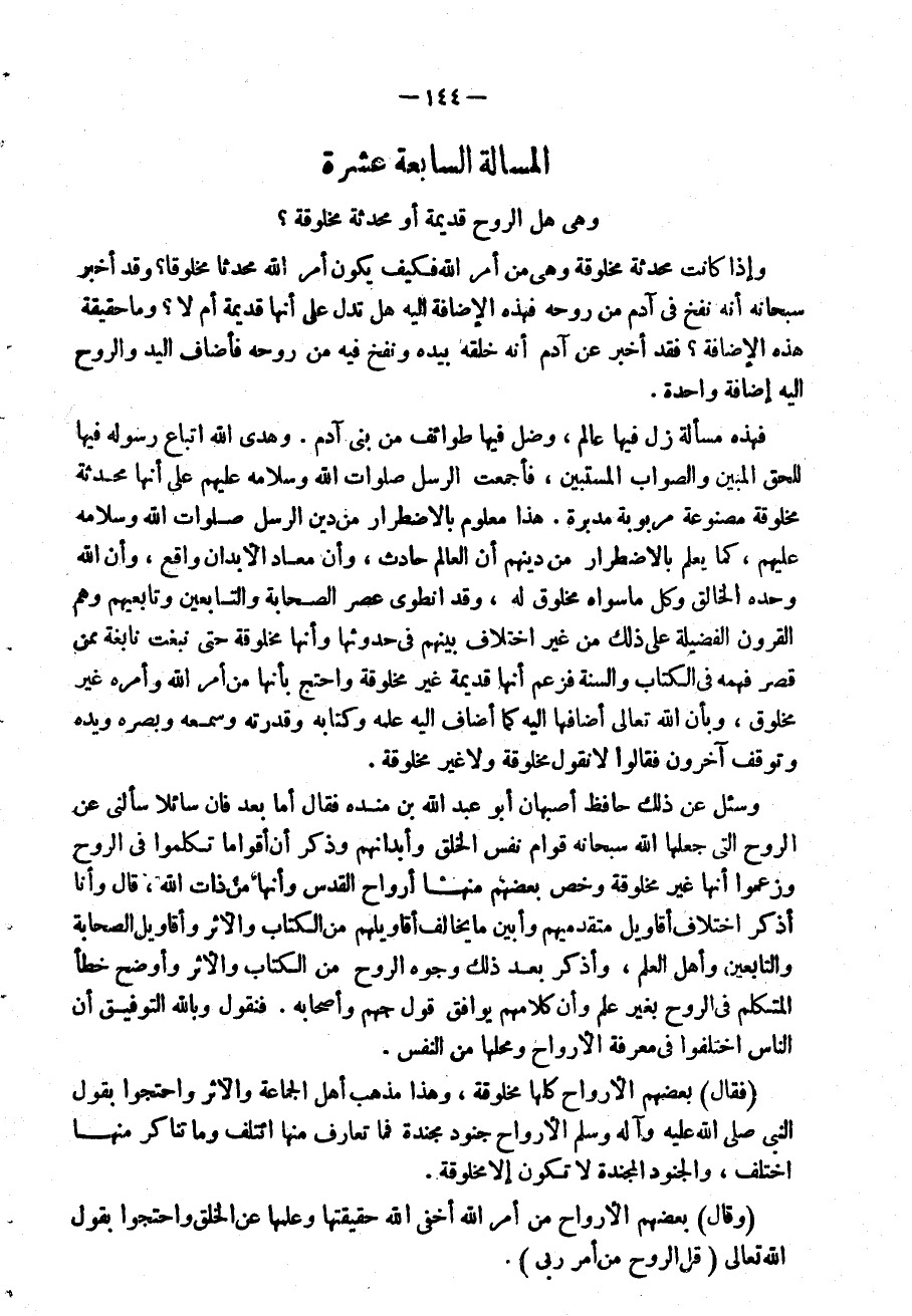 فَهَذِهِ مَسْأَلَة زل فِيهَا عَالم وضل فِيهَا طوائف من بنى آدم وَهدى الله اتِّبَاع رَسُوله فِيهَا للحق الْمُبين وَالصَّوَاب المستبين فأجمعت الرُّسُل صلوَات الله وَسَلَامه عَلَيْهِم على أَنَّهَا محدثة مخلوقة مصنوعة مربوبة مُدبرَة هَذَا مَعْلُوم بالاضطرار من دين الرُّسُل صلوَات الله وَسَلَامه عَلَيْهِم كَمَا يعلم بالاضطرار من دينهم أَن الْعَالم حَادث وَأَن معاد الْأَبدَان وَاقع وَأَن الله وَحده الْخَالِق وكل مَا سواهُ مَخْلُوق لَهُ وَقد انطوى عصر الصَّحَابَة وَالتَّابِعِينَ وتابعيهم وهم الْقُرُون الْفَضِيلَة على ذَلِك من غير اخْتِلَاف بَينهم فِي حدوثها وَأَنَّهَا مخلوقة حَتَّى نبغت نَابِغَة مِمَّن قصر فهمه فِي الْكتاب وَالسّنة فَزعم أَنَّهَا قديمَة غير مخلوقة وَاحْتج بِأَنَّهَا من أَمر الله وَأمره غير مَخْلُوق وَبِأَن الله تَعَالَى أضافها إِلَيْهِ كَمَا أضَاف إِلَيْهِ علمه وَكتابه وَقدرته وسَمعه وبصره وَيَده وَتوقف آخَرُونَ فَقَالُوا لَا نقُول مخلوقة وَلَا غير مخلوقة