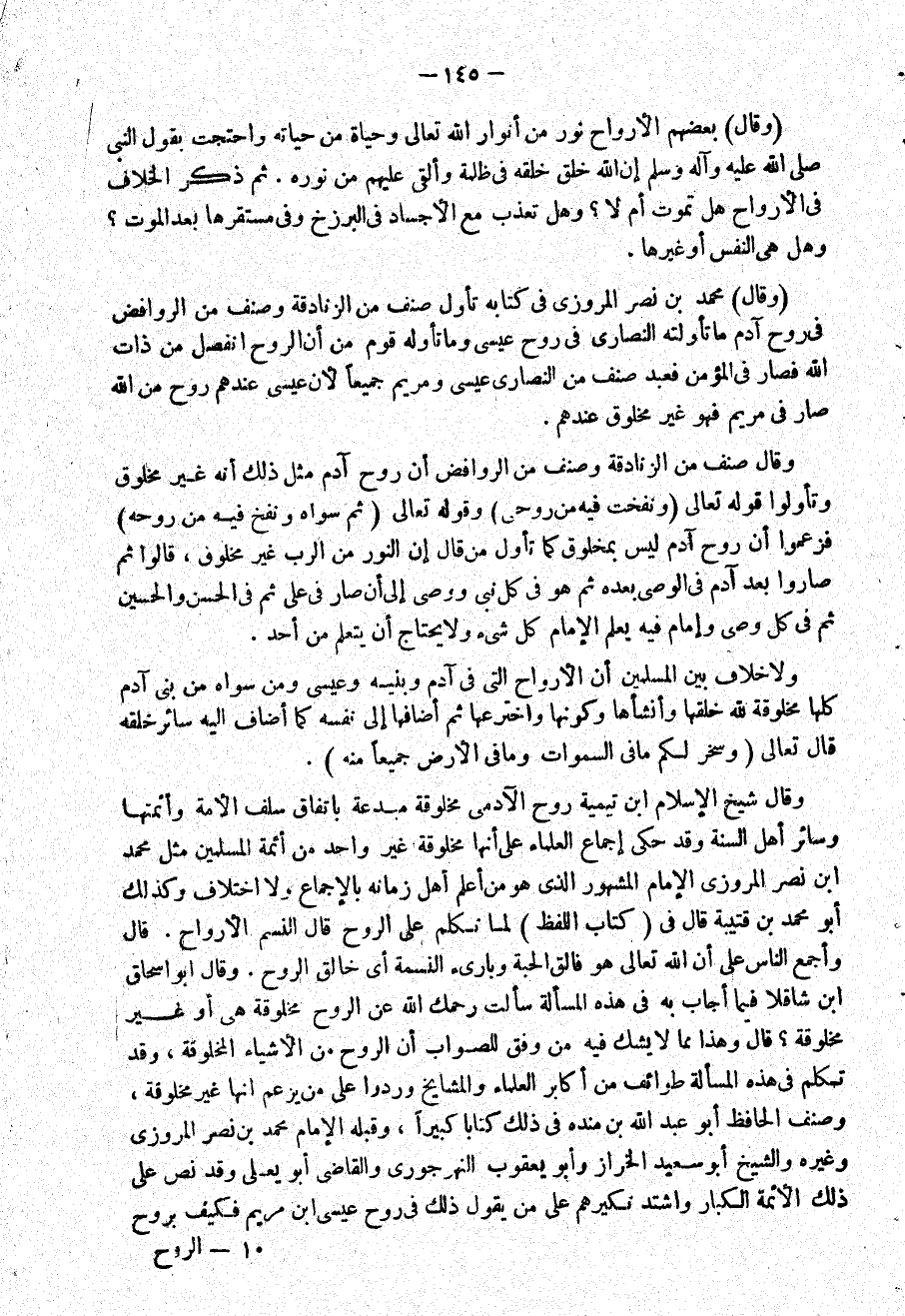 وَقَالَ شيخ الْإِسْلَام ابْن تَيْمِية روح الْآدَمِيّ مخلوقة مبدعة بإتفاق سلف الْأمة وأئمتها وَسَائِر أهل السّنة وَقد حكى إِجْمَاع الْعلمَاء على أَنَّهَا مخلوقة غير وَاحِد من أَئِمَّة الْمُسلمين مثل مُحَمَّد ابْن نصر المروزى الإِمَام الْمَشْهُور الَّذِي هُوَ من أعلم أهل زَمَانه بِالْإِجْمَاع وَلَا اخْتِلَاف وَكَذَلِكَ أَبُو مُحَمَّد بن قُتَيْبَة قَالَ فِي كتاب اللَّفْظ لما تكلم على الرّوح قَالَ النسم الْأَرْوَاح قَالَ وَأجْمع النَّاس على أَن الله تَعَالَى هُوَ فالق الْحبَّة وبارىء النَّسمَة أَي خَالق الرّوح وَقَالَ أَبُو إِسْحَاق ابْن شاقلا فِيمَا أجَاب بِهِ فِي هَذِه الْمَسْأَلَة سَأَلت رَحِمك الله عَن الرّوح مخلوقة هِيَ أَو غير مخلوقة قَالَ وَهَذَا مِمَّا لَا يشك فِيهِ من وفْق للصَّوَاب أَن الرّوح من الْأَشْيَاء المخلوقة وَقد تكلم فِي هَذِه الْمَسْأَلَة طوائف من أكَابِر الْعلمَاء والمشايخ وردوا على من يزْعم إِنَّهَا غير مخلوقة وصنف الْحَافِظ أَبُو عبد الله بن مَنْدَه فِي ذَلِك كتابا كَبِيرا وَقَبله الإِمَام مُحَمَّد بن نصر المروزى وَغَيره وَالشَّيْخ أَبُو سعيد الخراز وَأَبُو يَعْقُوب النَّهر جوري وَالْقَاضِي أَبُو يعلى وَقد نَص على ذَلِك الْأَئِمَّة الْكِبَار وَاشْتَدَّ نكيرهم على من يَقُول ذَلِك فِي روح عِيسَى ابْن مَرْيَم فَكيف بِروح