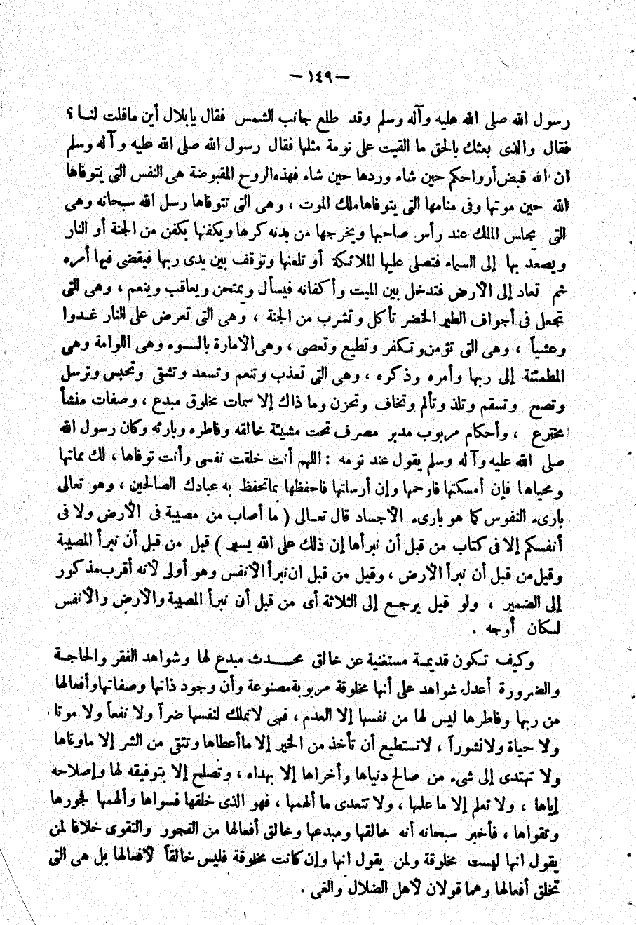 رَسُول الله وَقد طلع جَانب الشَّمْس فَقَالَ يَا بِلَال أَيْن مَا قلت لنا فَقَالَ وَالَّذِي بَعثك بِالْحَقِّ مَا ألقيت على نومَة مثلهَا فَقَالَ رَسُول الله ان الله قبض أرواحكم حِين شَاءَ وردهَا حِين شَاءَ فَهَذِهِ الرّوح المقبوضة هِيَ النَّفس الَّتِي يتوفاها الله حِين مَوتهَا وَفِي منامها الَّتِي يتوفاها ملك الْمَوْت وَهِي الَّتِي تتوفاها رسل الله سُبْحَانَهُ وَهِي الَّتِي يجلس الْملك عِنْد رَأس صَاحبهَا ويخرجها من بدنه كرها ويكفنها بكفن من الْجنَّة أَو النَّار ويصعد بهَا إِلَى السَّمَاء فتصلى عَلَيْهَا الْمَلَائِكَة أَو تلعنها وَتوقف بَين يَدي رَبهَا فَيقْضى فِيهَا أمره ثمَّ تُعَاد إِلَى الأَرْض فَتدخل بَين الْمَيِّت وأكفانه فَيسْأَل ويمتحن ويعاقب وينعم وَهِي الَّتِي تجْعَل فِي أَجْوَاف الطير الْخضر تَأْكُل وتشرب من الْجنَّة وَهِي الَّتِي تعرض على النَّار غدوا وعشيا وَهِي الَّتِي تؤمن وتكفر وتطيع وتعصى وَهِي الأمارة بالسوء وَهِي اللوامة وَهِي المطمئنة إِلَى رَبهَا وَأمره وَذكره وَهِي الَّتِي تعذب وتنعم وتسعد وتشقى وتحبس وَترسل وَتَصِح وتسقم وتلذ وتألم وَتخَاف وتحزن وَمَا ذَاك إِلَّا سمات مَخْلُوق مبدع وصفات منشأ مخترع وَأَحْكَام مربوب مُدبر مصرف تَحت مَشِيئَة خالقه وفاطره وبارئه وَكَانَ رَسُول الله يَقُول عِنْد نَومه اللَّهُمَّ أَنْت خلقت نَفسِي وَأَنت توفاها لَك مماتها ومحياها فَإِن أَمْسَكتهَا فإرحمها وَإِن أرسلتها فأحفظها بِمَا تحفظ بِهِ عِبَادك الصَّالِحين وَهُوَ تعلى بارىء النُّفُوس كَمَا هُوَ بارىء الأجساد قَالَ تَعَالَى {مَا أصَاب من مُصِيبَة فِي الأَرْض وَلَا فِي أَنفسكُم إِلَّا فِي كتاب من قبل أَن نبرأها إِن ذَلِك على الله يسير} قيل من قبل أَن نبرأ الْمُصِيبَة وَقيل من قبل أَن نبرأ الأَرْض وَقيل من قبل أَن نبرأ الْأَنْفس وَهُوَ أولى لِأَنَّهُ أقرب مَذْكُور إِلَى الضَّمِير وَلَو قيل يرجع إِلَى الثَّلَاثَة أَي من قبل أَن نبرأ الْمُصِيبَة وَالْأَرْض والأنفس لَكَانَ أوجه