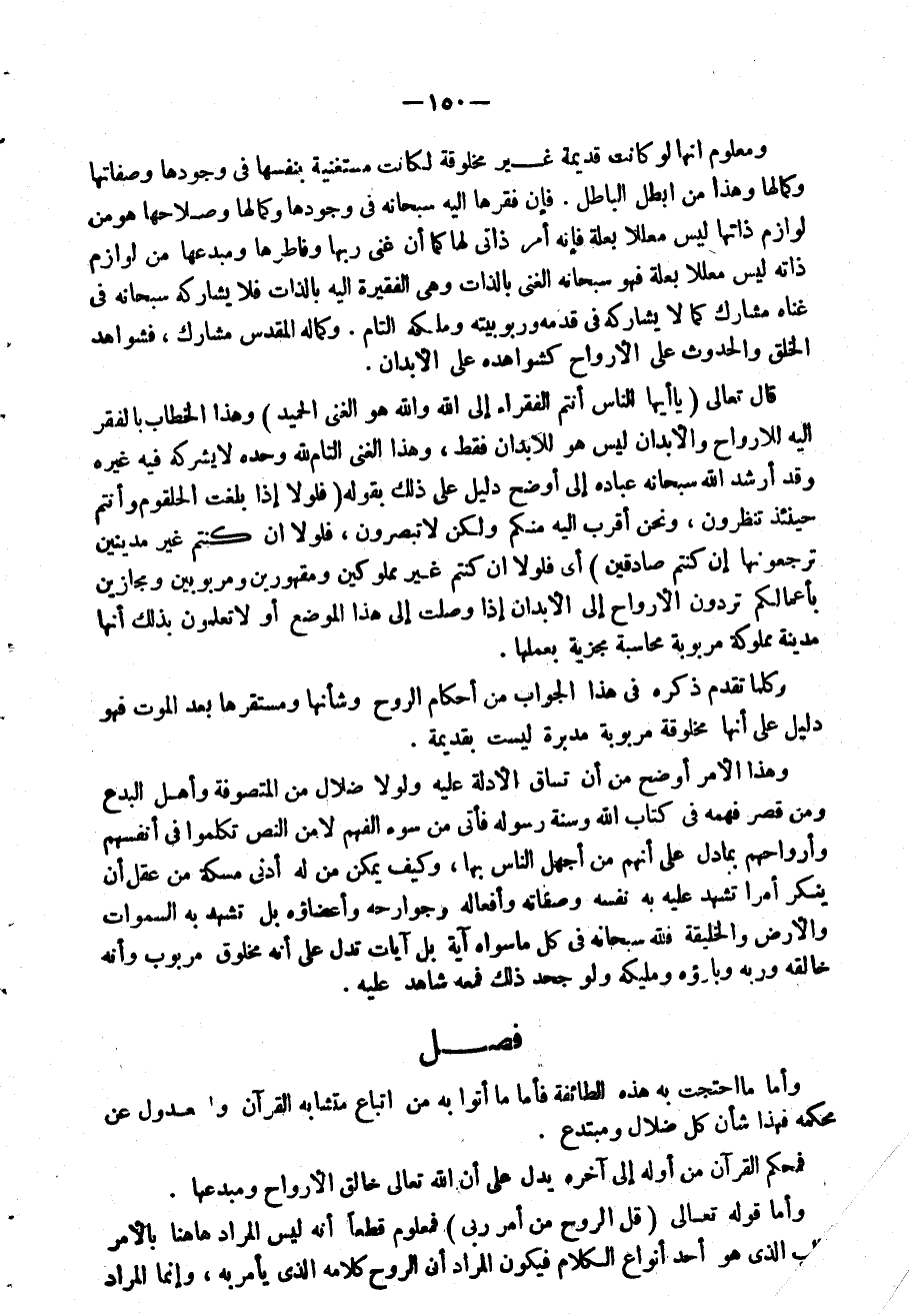 وَمَعْلُوم أَنَّهَا لَو كَانَت قديمَة غير مخلوقة لكَانَتْ مستغنية بِنَفسِهَا فِي وجودهَا وصفاتها وكمالها وَهَذَا من ابطل الْبَاطِل فَإِن فقرها إِلَيْهِ سُبْحَانَهُ فِي وجودهَا وكمالها وصلاحها هُوَ من لَوَازِم ذَاتهَا لَيْسَ مُعَللا بعلة فَإِنَّهُ أَمر ذاتي لَهَا كَمَا أَن غنى رَبهَا وفاطرها ومبدعها من لَوَازِم ذَاته لَيْسَ مُعَللا بعلة فَهُوَ سُبْحَانَهُ الْغنى بِالذَّاتِ وَهِي الفقيرة إِلَيْهِ بِالذَّاتِ فَلَا يُشَارِكهُ سُبْحَانَهُ فِي غناهُ مشارك كَمَا لَا يُشَارِكهُ فِي قدمه وربوبيته وَملكه التَّام وكماله الْمُقَدّس مشارك فشواهد الْخلق والحدوث على الْأَرْوَاح كشواهده على الْأَبدَان
