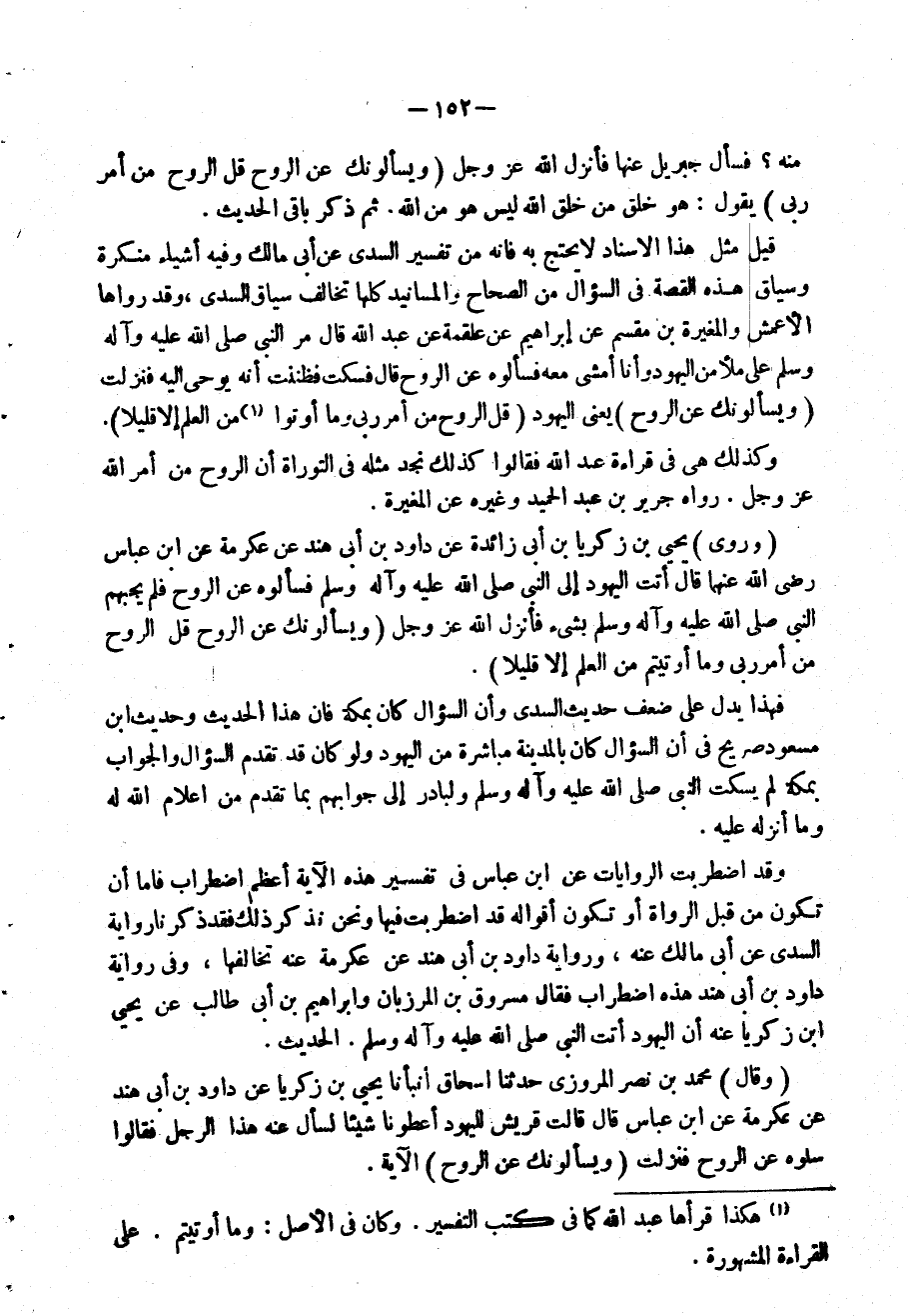 وروى يحيى بن زَكَرِيَّا بن أَبى زَائِدَة عَن دَاوُد بن أَبى هِنْد عَن عِكْرِمَة عَن ابْن عَبَّاس رضى الله عَنْهُمَا قَالَ أَتَت الْيَهُود إِلَى النَّبِي فَسَأَلُوهُ عَن الرّوح فَلم يجبهم النَّبِي بِشَيْء فَأنْزل الله عز وَجل {ويسألونك عَن الرّوح قل الرّوح من أَمر رَبِّي وَمَا أُوتِيتُمْ من الْعلم إِلَّا قَلِيلا}