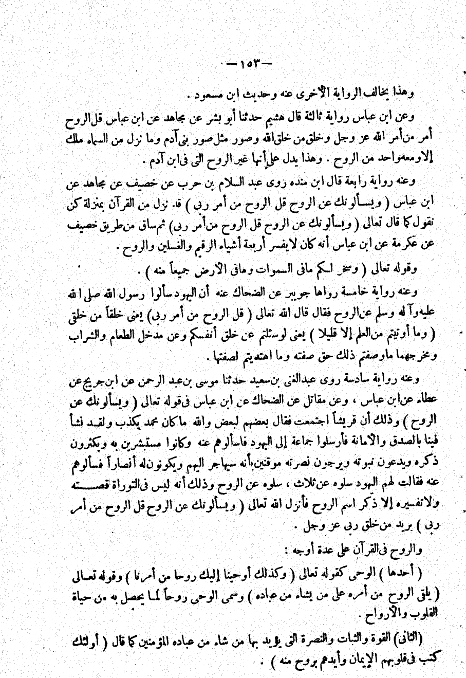 وَعَن ابْن عَبَّاس رِوَايَة ثَالِثَة قَالَ هشيم حَدثنَا أَبُو بشر عَن مُجَاهِد عَن ابْن عَبَّاس قل الرّوح أَمر من أَمر الله عز وَجل وَخلق من خلق الله وصور مثل صور بنى آدم وَمَا نزل من السَّمَاء ملك إِلَّا وَمَعَهُ وَاحِد من الرّوح وَهَذَا يدل على أَنَّهَا غير الرّوح الَّتِي فِي ابْن آدم