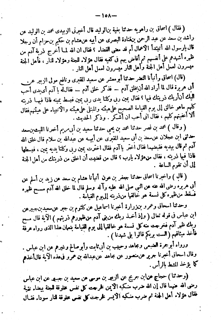 وَحدثنَا إِسْحَاق وَعمر بن زُرَارَة أخبرنَا إِسْمَاعِيل عَن كُلْثُوم بن جبر عَن سعيد بن جُبَير عَن ابْن عَبَّاس فِي قَوْله تَعَالَى {وَإِذ أَخذ رَبك من بني آدم من ظُهُورهمْ ذُرِّيتهمْ} الْآيَة قَالَ مسح رَبك ظهر آدم فَخرجت مِنْهُ كل نسمَة هُوَ خَالِقهَا إِلَى يَوْم الْقِيَامَة بنعمان هَذَا الَّذِي رَوَاهُ عَرَفَة فَأخذ ميثاقهم {أَلَسْت بربكم قَالُوا بلَى شَهِدنَا}