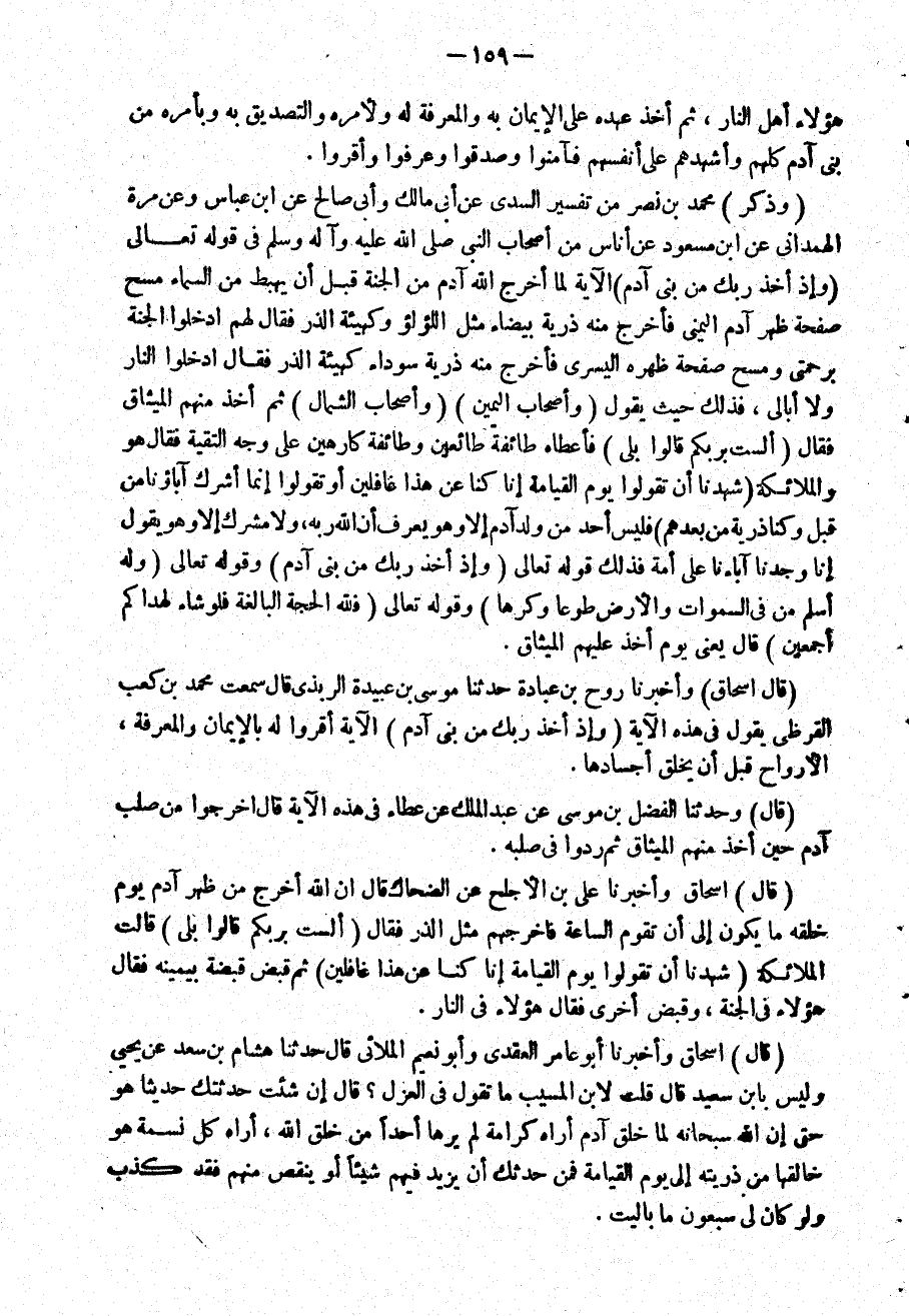 وَذكر مُحَمَّد بن نصر من تَفْسِير السدى عَن أَبى مَالك وأبى صَالح عَن ابْن عَبَّاس وَعَن مرّة الهمدانى عَن ابْن مَسْعُود عَن أنَاس من أَصْحَاب النَّبِي فِي قَوْله تَعَالَى {وَإِذ أَخذ رَبك من بني آدم} الْآيَة لما أخرج الله آدم من الْجنَّة قبل ان يهْبط من السَّمَاء مسح صفحة ظهر آدم الْيُمْنَى فَأخْرج مِنْهُ ذُرِّيَّة بَيْضَاء مثل اللُّؤْلُؤ وكهيئة الذَّر فَقَالَ لَهُم ادخُلُوا الْجنَّة برحمتي وَمسح صفحة ظَهره الْيُسْرَى فَأخْرج مِنْهُ ذُرِّيَّة سَوْدَاء كَهَيئَةِ الذَّر فَقَالَ ادخُلُوا النَّار وَلَا أُبَالِي فَذَلِك حَيْثُ يَقُول وَأَصْحَاب الْيَمين وَأَصْحَاب الشمَال ثمَّ أَخذ مِنْهُم الْمِيثَاق فَقَالَ {أَلَسْت بربكم قَالُوا بلَى} فَأعْطَاهُ طَائِفَة طائعين وَطَائِفَة كارهين على وَجه التقية فَقَالَ هُوَ وَالْمَلَائِكَة {شَهِدنَا أَن تَقولُوا يَوْم الْقِيَامَة إِنَّا كُنَّا عَن هَذَا غافلين أَو تَقولُوا إِنَّمَا أشرك آبَاؤُنَا من قبل وَكُنَّا ذُرِّيَّة من بعدهمْ} فَلَيْسَ أحد من ولد آدم إِلَّا وَهُوَ يعرف أَن الله ربه وَلَا مُشْرك إِلَّا وَهُوَ يَقُول إِنَّا وجدنَا آبَاءَنَا على أمة فَذَلِك قَوْله تَعَالَى {وَإِذ أَخذ رَبك من بني آدم} وَقَوله تَعَالَى وَله أسلم من فِي السَّمَوَات وَالْأَرْض طَوْعًا وَكرها وَقَوله تَعَالَى {فَللَّه الْحجَّة الْبَالِغَة فَلَو شَاءَ لهداكم أَجْمَعِينَ} قَالَ يعْنى يَوْم أَخذ عَلَيْهِم الْمِيثَاق