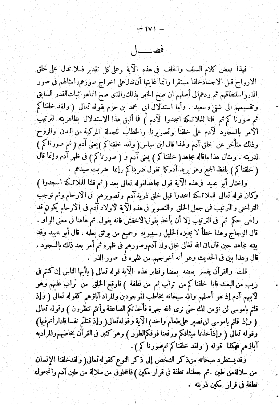 وَاخْتَارَ أَبُو عبيد فِي هَذِه الْآيَة قَول مُجَاهِد لقَوْله تَعَالَى بعد ثمَّ قُلْنَا للْمَلَائكَة اسجدوا وَكَانَ قَوْله تَعَالَى للْمَلَائكَة اسجدوا قبل خلق ذُرِّيَّة آدم وتصويرهم فِي الْأَرْحَام وَثمّ توجب التَّرَاخِي وَالتَّرْتِيب فَمن جعل الْخلق والتصوير فِي هَذِه الْآيَة لأَوْلَاد آدم فِي الْأَرْحَام يكون قد رَاعى حكم ثمَّ فِي التَّرْتِيب إِلَّا أَن يَأْخُذ بقول الْأَخْفَش فَإِنَّهُ يَقُول ثمَّ هَا هُنَا فِي معنى الْوَاو قَالَ الزّجاج وَهَذَا خطأ لَا يُجِيزهُ الْخَلِيل وسيبويه وَجَمِيع من يوثق بِعِلْمِهِ قَالَ أَبُو عبيد وَقد بَينه مُجَاهِد حِين قَالَ إِن الله تَعَالَى خلق ولد آدم وصورهم فِي ظَهره ثمَّ أَمر بعد ذَلِك بِالسُّجُود قَالَ وَهَذَا بَين فِي الحَدِيث وَهُوَ أَنه أخرجهم من ظَهره فِي صور الذَّر