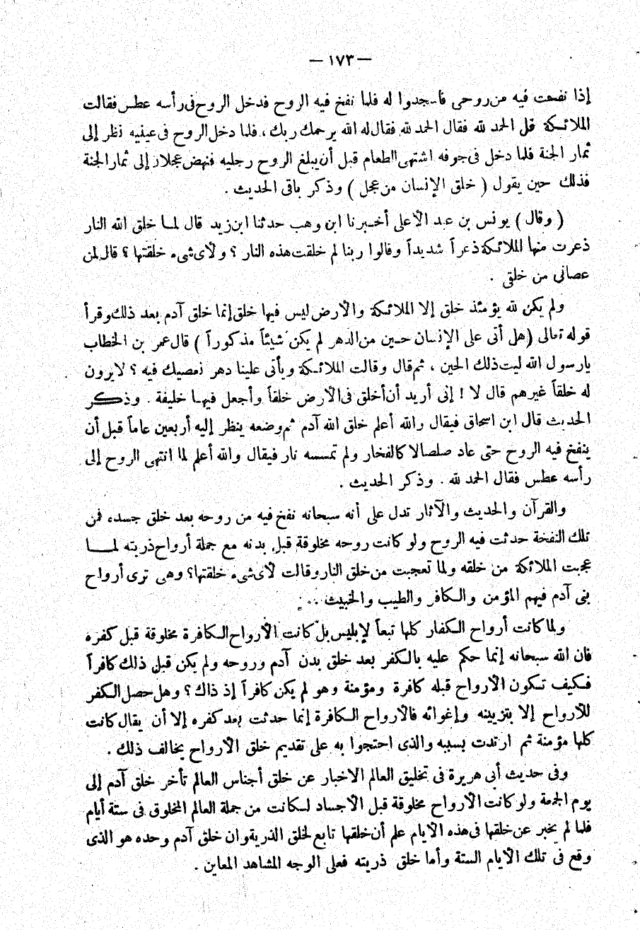 وَفِي حَدِيث أَبى هُرَيْرَة فِي تخليق الْعَالم الْأَخْبَار عَن خلق أَجنَاس الْعَالم تَأَخّر خلق آدم إِلَى يَوْم الْجُمُعَة وَلَو كَانَت الْأَرْوَاح مخلوقة قبل الأجساد لكَانَتْ من جملَة الْعَالم الْمَخْلُوق فِي سِتَّة أَيَّام فَلَمَّا لم يخبر عَن خلقهَا فِي هَذِه الْأَيَّام علم أَن خلقهَا تَابع لخلق الذُّرِّيَّة وَأَن خلق آدم وَحده هُوَ الَّذِي وَقع فِي تِلْكَ الْأَيَّام السِّتَّة وَأما خلق ذُريَّته فعلى الْوَجْه الْمشَاهد المعاين