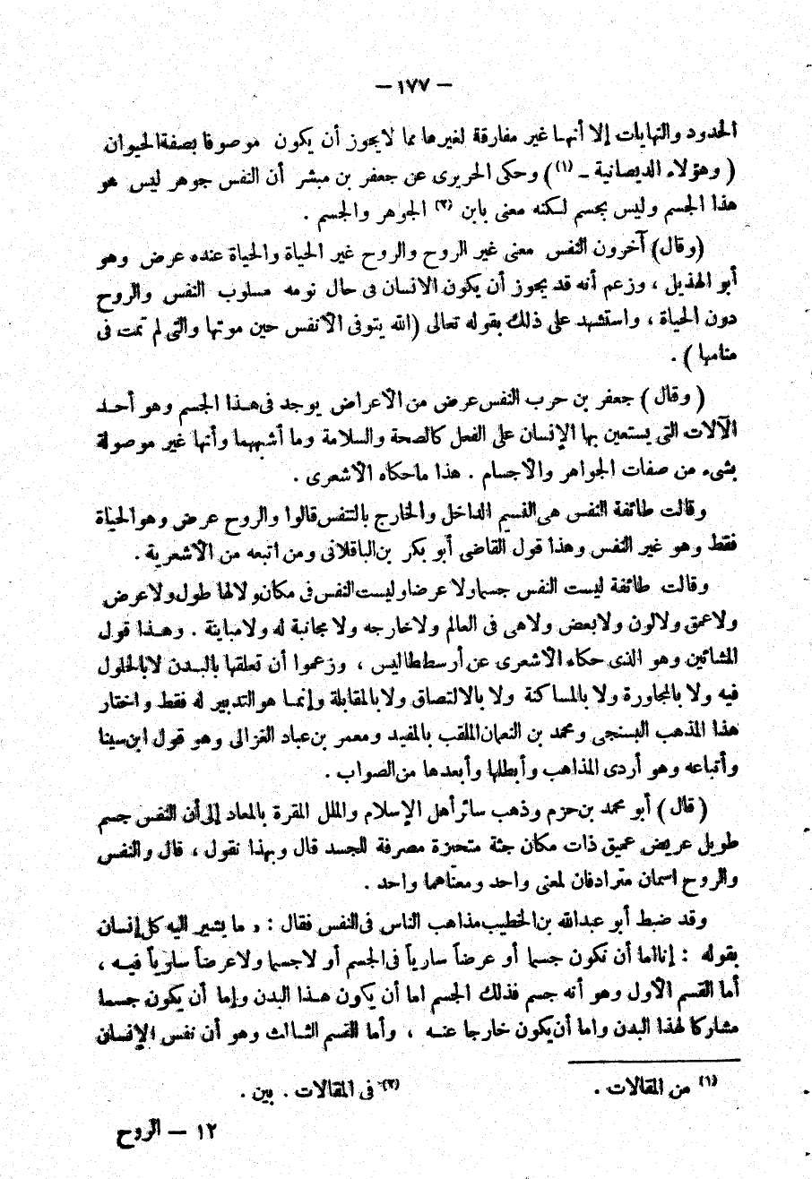 وَقَالَ جَعْفَر بن حَرْب النَّفس عرض من الْأَعْرَاض يُوجد فِي هَذَا الْجِسْم وَهُوَ أحد الْآلَات الَّتِي يَسْتَعِين بهَا الْإِنْسَان على الْفِعْل كالصحة والسلامة وَمَا أشبههما وَأَنَّهَا غير مَوْصُولَة بِشَيْء من صِفَات الْجَوَاهِر والأجسام هَذَا مَا حَكَاهُ الْأَشْعَرِيّ