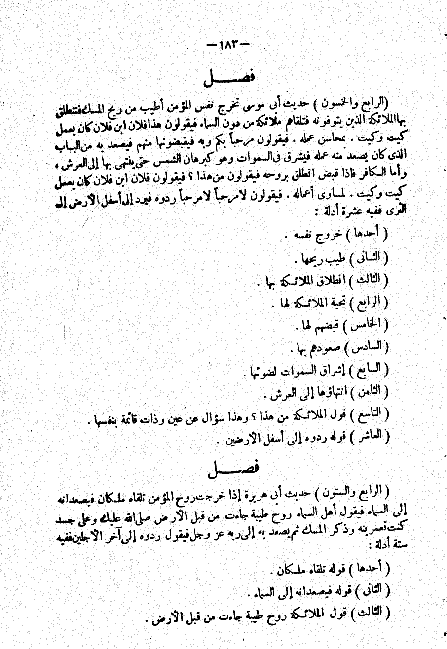 فيصعدانه إِلَى السَّمَاء فَيَقُول أهل السَّمَاء روح طيبَة جَاءَت من قبل الأَرْض صلى الله عَلَيْك وعَلى جَسَد كنت تعمرينه وَذكر الْمسك ثمَّ يصعد بِهِ إِلَى ربه عز وَجل فَيَقُول ردُّوهُ إِلَى آخر الْأَجَليْنِ فَفِيهِ سِتَّة أَدِلَّة