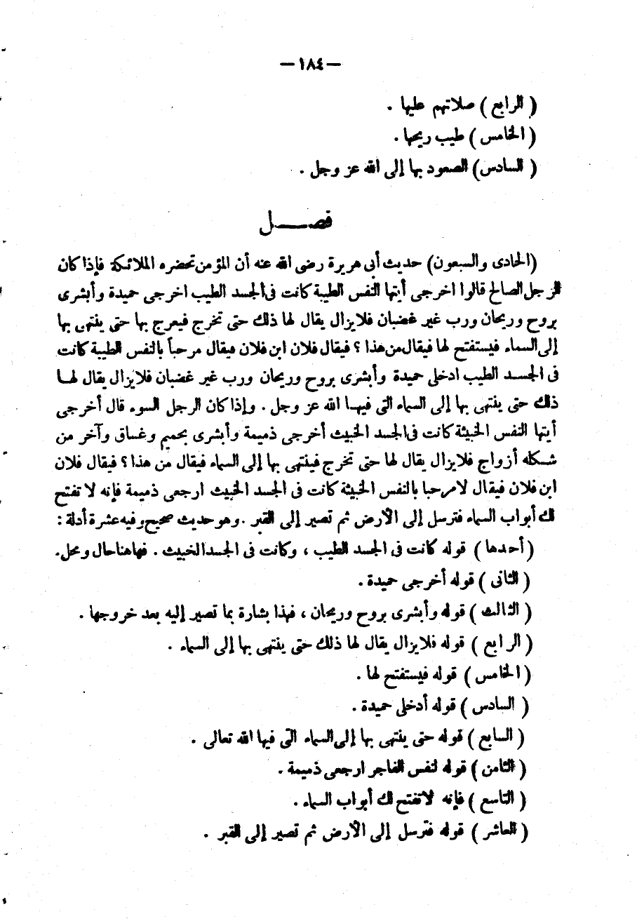 الْمَلَائِكَة فَإِذا كَانَ الرجل الصَّالح قَالُوا أَخْرِجِي أيتها النَّفس الطّيبَة كَانَت فِي الْجَسَد الطّيب أَخْرِجِي حميدة وَأَبْشِرِي بِروح وَرَيْحَان وَرب غير غَضْبَان فَلَا يزَال يُقَال لَهَا ذَلِك حَتَّى تخرج فيعرج بهَا حَتَّى يَنْتَهِي بهَا إِلَى السَّمَاء فيستفتح لَهَا فَيُقَال من هَذَا فَيُقَال فلَان ابْن فلَان فَيُقَال مرْحَبًا بِالنَّفسِ الطّيبَة كَانَت فِي الْجَسَد الطّيب ادخلي حميدة وأبشرى بِروح وَرَيْحَان وَرب غير غَضْبَان فَلَا يزَال يُقَال لَهَا ذَلِك حَتَّى يَنْتَهِي بهَا إِلَى السَّمَاء الَّتِي فِيهَا الله عز وَجل وَإِذا كَانَ الرجل السوء قَالَ أَخْرِجِي أيتها النَّفس الخبيثة كَانَت فِي الْجَسَد الْخَبيث أَخْرِجِي ذميمة وَأَبْشِرِي بحميم وغساق وَآخر من شكله أَزوَاج فَلَا يزَال يُقَال لَهَا حَتَّى تخرج فينتهي بهَا إِلَى السَّمَاء فَيُقَال من هَذَا فَيُقَال فلَان ابْن فلَان فَيُقَال لَا مرْحَبًا بِالنَّفسِ الخبيثة كَانَت فِي الْجَسَد الْخَبيث ارجعي ذميمة فَإِنَّهُ لَا تفتح لَك أَبْوَاب السَّمَاء فترسل إِلَى الأَرْض ثمَّ تصير إِلَى الْقَبْر وَهُوَ حَدِيث صَحِيح وَفِيه عشرَة أَدِلَّة
