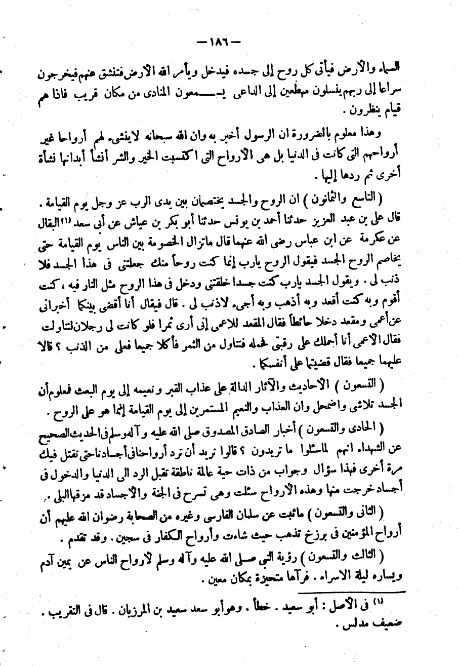 التِّسْعُونَ الْأَحَادِيث والْآثَار الدَّالَّة على عَذَاب الْقَبْر ونعيمه إِلَى يَوْم الْبَعْث فمعلوم أَن الْجَسَد تلاشى واضمحل وَأَن الْعَذَاب وَالنَّعِيم المستمرين إِلَى يَوْم الْقِيَامَة إِنَّمَا هُوَ على الرّوح