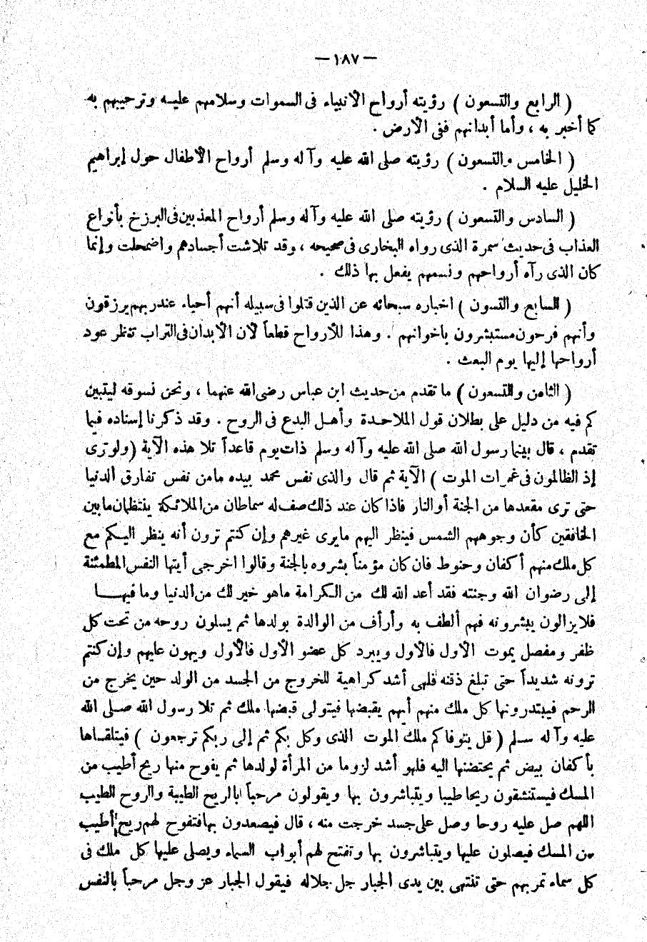 السَّادِس وَالتِّسْعُونَ رُؤْيَته أَرْوَاح الْمُعَذَّبين فِي البرزخ بأنواع الْعَذَاب فِي حَدِيث سَمُرَة الَّذِي رَوَاهُ البُخَارِيّ فِي صَحِيحه وَقد تلاشت أَجْسَادهم واضمحلت وَإِنَّمَا كَانَ الَّذِي رَآهُ أَرْوَاحهم ونسمهم يفعل بهَا ذَلِك