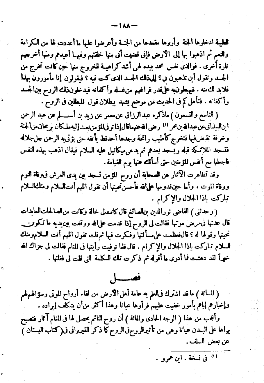 التَّاسِع وَالتِّسْعُونَ مَا ذكره عبد الرَّزَّاق عَن معمر عَن زيد بن أسلم عَن عبد الرَّحْمَن ابْن الْبَيْلَمَانِي عَن عبد الله بن عمر رَضِي الله عَنْهُمَا قَالَ إِذا توفّي الْمُؤمن بعث إِلَيْهِ ملكان بريحان من الْجنَّة وخرقة تقبض فِيهَا فَتخرج كأطيب رَائِحَة وجدهَا أحد قطّ بِأَنْفِهِ حَتَّى يُؤْتى بِهِ الرَّحْمَن جلّ جَلَاله فتسجد الْمَلَائِكَة قبله وَيسْجد بعدهمْ ثمَّ يدعى مِيكَائِيل عَلَيْهِ السَّلَام فَيُقَال اذْهَبْ بِهَذِهِ النَّفس فإجلعها مَعَ أنفس الْمُؤمنِينَ حَتَّى أَسأَلك عَنْهَا يَوْم الْقِيَامَة