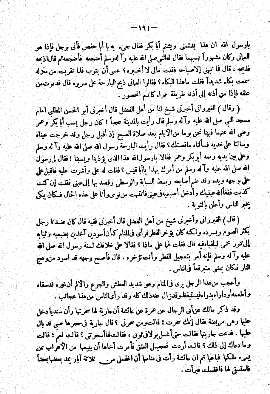 قَالَ القيرواني وَأَخْبرنِي شيخ من أهل الْفضل قَالَ أَخْبرنِي فَقِيه قَالَ كَانَ عندنَا رجل يكثر الصَّوْم ويسرده وَلكنه كَانَ يُؤَخر الْفطر فرأي فِي الْمَنَام كَأَن أسودين آخذين بضبعيه وثيابه إِلَى تنور محمى ليلقياه قَالَ فَقلت لَهما على مَاذَا فَقَالَا على خِلافك لسنة رَسُول الله فَإِنَّهُ أَمر بتعجيل الْفطر وَأَنت تؤخره قَالَ فأصح وَجهه قد اسود من وهج النَّار فَكَانَ يمشي متبرقعا فِي النَّاس