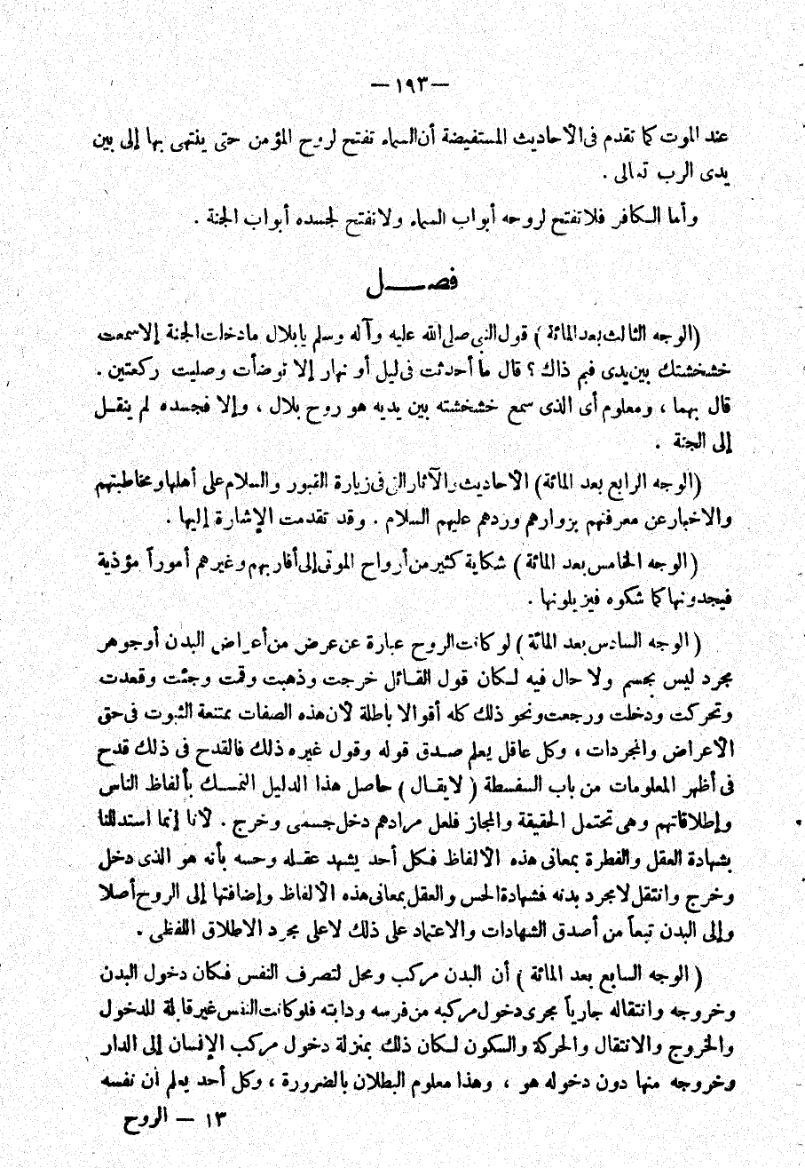 الْوَجْه السَّادِس بعد الْمِائَة لَو كَانَت الرّوح عبارَة عَن عرض من أَعْرَاض الْبدن أَو جَوْهَر مُجَرّد لَيْسَ بجسم وَلَا حَال فِيهِ لَكَانَ قَول الْقَائِل خرجت وَذَهَبت وَقمت وَجئْت وَقَعَدت وتحركت وَدخلت وَرجعت وَنَحْو ذَلِك كُله أقوالا بَاطِلَة لِأَن هَذِه الصِّفَات ممتنعة الثُّبُوت فِي حق الْأَعْرَاض والمجردات وكل عَاقل يعلم صدق قَوْله وَقَول غَيره ذَلِك فالقدح ذَلِك قدح فِي أظهر المعلومات من بَاب السفسطة لَا يُقَال حَاصِل هَذَا الدَّلِيل التَّمَسُّك بِأَلْفَاظ النَّاس وإطلاقاتهم وَهِي تحْتَمل الْحَقِيقَة وَالْمجَاز فَلَعَلَّ مُرَادهم دخل جسمي وَخرج لأَنا إِنَّمَا استدللنا بِشَهَادَة الْعقل والفطرة بمعاني هَذِه الْأَلْفَاظ فَكل أحد يشْهد عقله وحسه بِأَنَّهُ هُوَ الَّذِي دخل وَخرج وانتقل لَا مُجَرّد بدنه فشهادة الْحس وَالْعقل بمعاني هَذِه الْأَلْفَاظ وإضافتها إِلَى الرّوح أصلا وَإِلَى الْبدن تبعا من أصدق الشَّهَادَات والاعتماد على ذَلِك مُجَرّد الْإِطْلَاق اللَّفْظِيّ