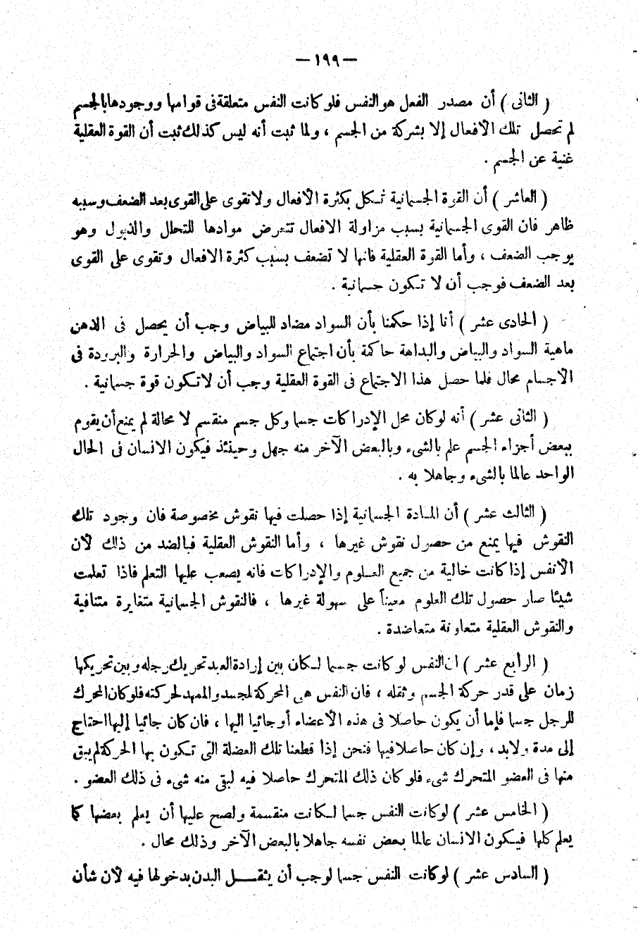 الرَّابِع عشر أَن النَّفس لَو كَانَت جسما لَكَانَ بَين إِرَادَة العَبْد تَحْرِيك رجله وَبَين تحريكها زمَان على قدر حَرَكَة الْجِسْم وَثقله فَإِن النَّفس هِيَ المحركة لمجسد والممهد لحركته فَلَو كَانَ المحرك للرجل جسما فإمَّا أَن يكون حَاصِلا فِي هَذِه الْأَعْضَاء أَو جائيا إِلَيْهَا فَإِن كَانَ جائيا إِلَيْهَا احْتَاجَ إِلَى مُدَّة وَلَا بُد وَإِن كَانَ حَاصِلا فِيهَا فَنحْن إِذا قَطعنَا تِلْكَ العضلة الَّتِي تكون بهَا الْحَرَكَة لم يبْق مِنْهَا فِي الْعُضْو المتحرك شَيْء فَلَو كَانَ ذَلِك المتحرك حَاصِلا فِيهِ لبقي مِنْهُ شَيْء فِي ذَلِك الْعُضْو