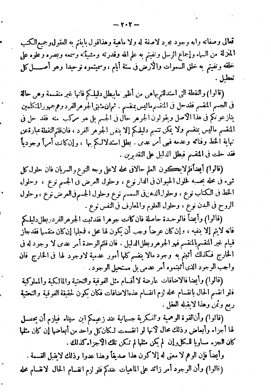 قَالُوا والنقطة الَّتِي استدللتم بهَا هِيَ من أظهر مَا يبطل دليلكم فَإِنَّهَا غير منقسمة وَهِي حَالَة فِي الْجِسْم المنقسم فقد حل فِي المنقسم مَا لَيْسَ بمنقسم ثمَّ إِن مثبتي الْجَوْهَر الْفَرد وهم جُمْهُور الْمُتَكَلِّمين ينازعونكم فِي هَذَا الأَصْل وَيَقُولُونَ الْجَوْهَر حَال فِي الْجِسْم بل هُوَ مركب مِنْهُ فقد حل فِي المنقسم مَا لَيْسَ بمنقسم وَلَا يُمكن تتميم دليلكم إِلَّا بِنَفْي الْجَوْهَر الْفَرد فَإِن قُلْتُمْ النقطة عبارَة عَن نِهَايَة الْخط وفنائه وَعَدَمه فَهِيَ أَمر عدمي بَطل استدلالكم بهَا وَإِن كَانَت أمرا وجوديا فقد حلت فِي المنقسم فَبَطل الدَّلِيل على التَّقْدِيرَيْنِ
