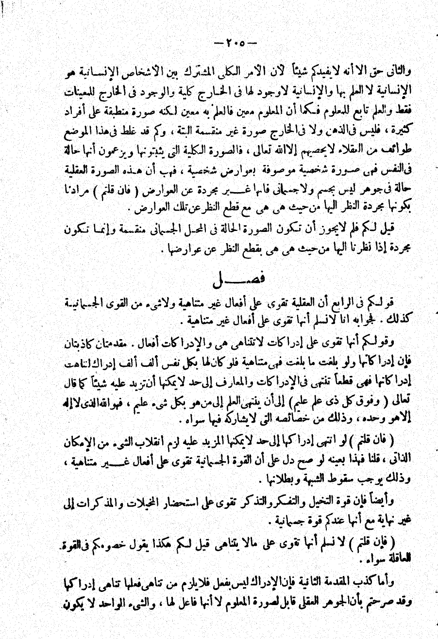 وَالثَّانِي حق إِلَّا أَنه يفيدكم شَيْئا لِأَن الْأَمر الْكُلِّي الْمُشْتَرك بَين الْأَشْخَاص الإنسانية هُوَ الإنسانية لَا الْعلم بهَا والإنسانية لَا وجود لَهَا فِي الْخَارِج كُلية والوجود فِي الْخراج للمعينات فَقَط وَالْعلم تَابع للمعلوم فَكَمَا أَن الْمَعْلُوم معِين فالعلم بِهِ معِين لكنه صُورَة منطبقة على أَفْرَاد كَثِيرَة فَلَيْسَ فِي الذِّهْن وَلَا فِي الْخَارِج صُورَة غير منقسمة الْبَتَّةَ وَكم قد غلط فِي هَذَا الْموضع طوائف من الْعُقَلَاء لَا يحصيهم إِلَّا الله تَعَالَى فالصورة الْكُلية الَّتِي يثبتونها ويزعمون أَنَّهَا حَالَة فِي النَّفس فَهِيَ صُورَة شخصية مَوْصُوفَة بعوارض شخصية فَهَب أَن هَذِه الصُّورَة الْعَقْلِيَّة حَالَة فِي جَوْهَر لَيْسَ بجسم وَلَا جسماني فَإِنَّهَا غير مُجَرّدَة عَن الْعَوَارِض فَإِن قُلْتُمْ مرادنا بِكَوْنِهَا مُجَرّدَة النّظر إِلَيْهَا من حَيْثُ هِيَ هِيَ مَعَ قطع النّظر عَن تِلْكَ الْعَوَارِض