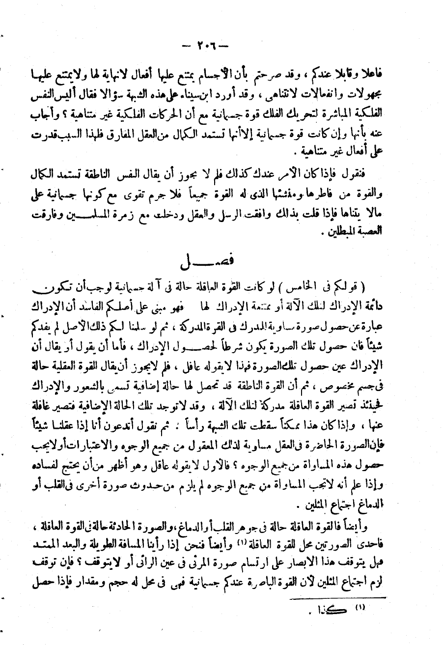 فصل قَوْلكُم فِي الْخَامِس لَو كَانَت الْقُوَّة الْعَاقِلَة حَالَة فِي آلَة جسمانية لوَجَبَ