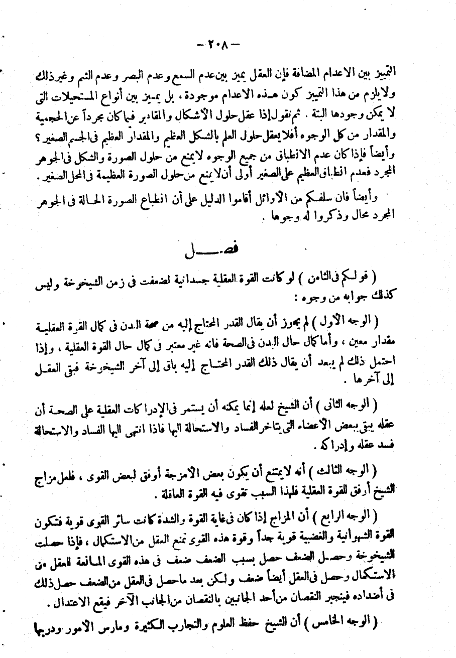 الْوَجْه الثَّانِي أَن الشَّيْخ لَعَلَّه إِنَّمَا يُمكنهُ أَن يسْتَمر فِي الإدراكات الْعَقْلِيَّة على الصِّحَّة أَن عقله يبْقى بِبَعْض الْأَعْضَاء الَّتِي يتَأَخَّر الْفساد والاستحالة إِلَيْهَا فَإِذا انتهي إِلَيْهَا الْفساد والاستحالة فسد عقله وإدراكه