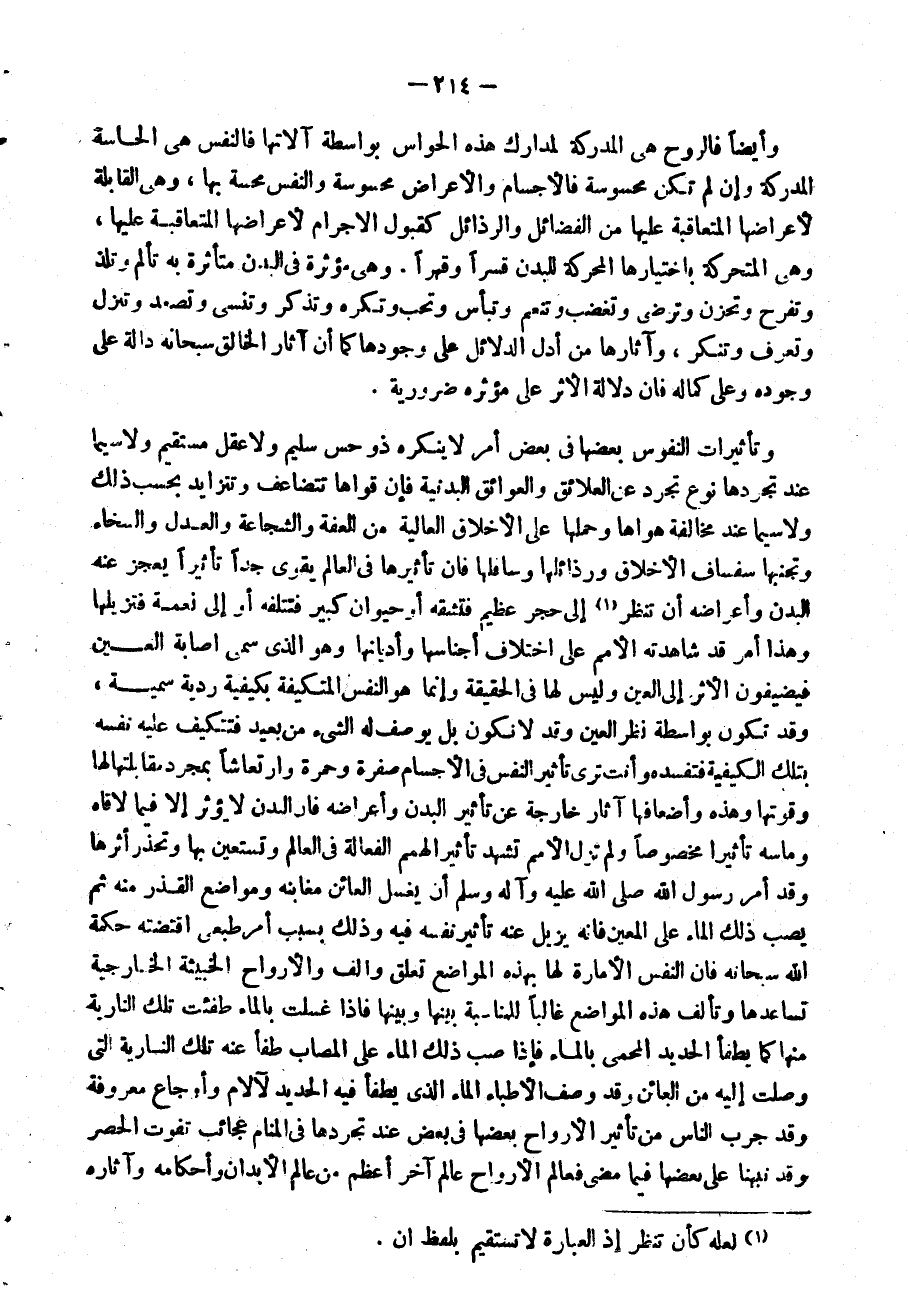 وتأثيرات النُّفُوس بَعْضهَا فِي بعض أَمر لَا يُنكره ذُو حس سليم وَلَا عقل مُسْتَقِيم وَلَا سِيمَا عِنْد تجردها نوع تجرد عَن العلائق والعوائق الْبَدَنِيَّة فَإِن قواها تتضاعف وتتزايد بِحَسب ذَلِك وَلَا سِيمَا عِنْد مُخَالفَة هَواهَا وَحملهَا على الْأَخْلَاق الْعَالِيَة من الْعِفَّة والشجاعة وَالْعدْل والسخاء وتجنبها سفساف الْأَخْلَاق ورذائلها وسافلها فَإِن تأثيرها فِي الْعَالم يُقَوي جدا تَأْثِيرا يعجز عَنهُ الْبدن وأعراضه أَن تنظر إِلَى حجر عَظِيم فتشقه أَو حَيَوَان كَبِير فتتلفه أَو إِلَى نعْمَة فتزيلها وَهَذَا أَمر قد شاهدته الْأُمَم على اخْتِلَاف أجناسها وأديانها وَهُوَ الَّذِي سمى إِصَابَة الْعين فيضيفون الْأَثر إِلَى الْعين وَلَيْسَ لَهَا فِي الْحَقِيقَة وَإِنَّمَا هُوَ النَّفس المتكيفة بكيفية ردية سميَّة وَقد تكون بِوَاسِطَة نظر الْعين وَقد لَا نَكُون بل يُوصف لَهُ الشَّيْء من بعيد فتتكيف عَلَيْهِ نَفسه بِتِلْكَ الْكَيْفِيَّة فتفسده وَأَنت ترى تَأْثِير النَّفس فِي الْأَجْسَام صفرَة وَحُمرَة وارتعاشا بِمُجَرَّد مقابلتها لَهَا وقوتها وَهَذِه وأضعافها آثَار خَارِجَة عَن تَأْثِير الْبدن وأعراضه فَإِن الْبدن لَا يُؤثر إِلَّا فِيمَا لاقاه وماسه تَأْثِيرا مَخْصُوصًا وَلم تزل الْأُمَم تشهد تَأْثِير الهمم الفعالة فِي الْعَالم وتستعين بهَا وتحذر أَثَرهَا وَقد أَمر رَسُول الله أَن يغسل العائن مغابنه ومواضع القذر مِنْهُ ثمَّ يصب ذَلِك المَاء على الْمعِين فَإِنَّهُ يزِيل عَنهُ تَأْثِير نَفسه فِيهِ وَذَلِكَ بِسَبَب أَمر طبعي اقتضته حِكْمَة الله سُبْحَانَهُ فَإِن النَّفس الأمارة لَهَا بِهَذِهِ الْمَوَاضِع تعلق وَألف والأرواح الخبيثة الخارجية تساعدها وتألف هَذِه الْمَوَاضِع غَالِبا للمناسبة بَينهَا وَبَينهَا فَإِذا غسلت بِالْمَاءِ طفئت تِلْكَ النارية مِنْهَا كَمَا يطفأ الْحَدِيد المحمى بِالْمَاءِ فَإِذا صب ذَلِك المَاء على الْمُصَاب طفأ عَنهُ تِلْكَ النارية الَّتِي وصلت إِلَيْهِ من البعائن وَقد وصف الْأَطِبَّاء المَاء الَّذِي يطفأ فِيهِ الْحَدِيد لآلام وأوجاع مَعْرُوفَة وَقد جرب النَّاس من تَأْثِير الْأَرْوَاح بَعْضهَا فِي بعض عِنْد تجردها فِي الْمَنَام عجائب تفوت الْحصْر وَقد نبهنا على بَعْضهَا فِيمَا مضى فعالم الْأَرْوَاح عَالم آخر أعظم من عَالم الْأَبدَان وَأَحْكَامه وآثاره