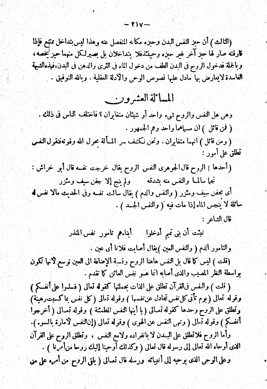 الْمَسْأَلَة الْعشْرُونَ وَهِي هَل النَّفس وَالروح شَيْء وَاحِد أَو شَيْئَانِ متغايران