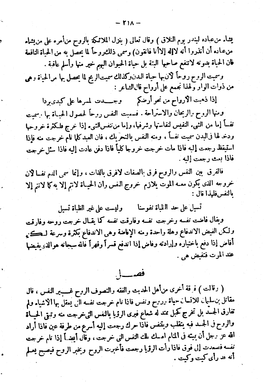 فصل وَقَالَت فرقة أُخْرَى من أهل الحَدِيث وَالْفِقْه والتصوف الرّوح غير النَّفس