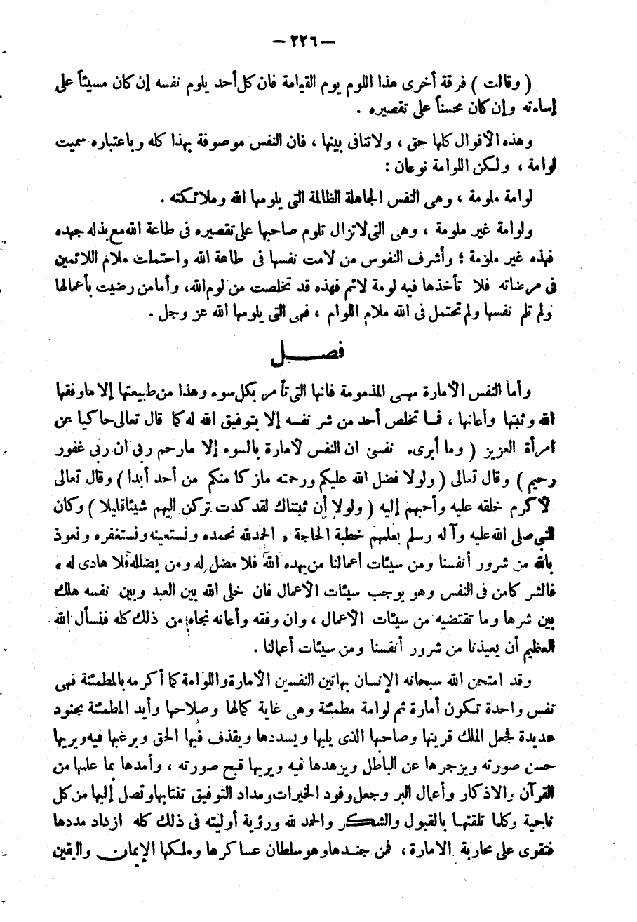 فصل وَأما النَّفس الأمارة فَهِيَ المذمومة فَإِنَّهَا الَّتِي تَأمر بِكُل سوء وَهَذَا من