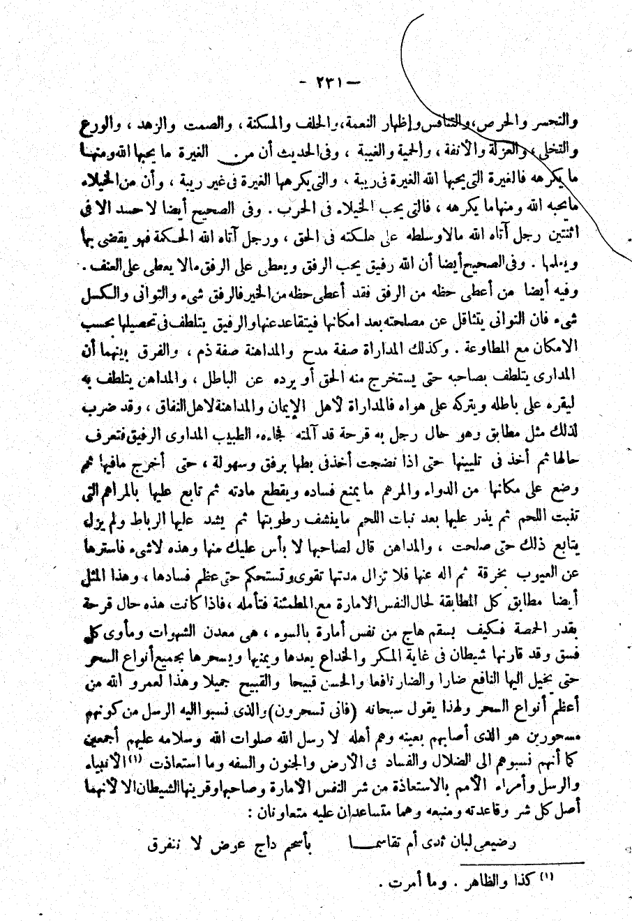 والتحسر والحرص والتنافس وَإِظْهَار النِّعْمَة وَالْحلف والمسكنة والصمت والزهد والورع والتخلي وَالْعُزْلَة والأنفة وَالْحمية والغيبة وَفِي الحَدِيث أَن من الْغيرَة مَا يُحِبهَا الله وَمِنْهَا مَا يكرههُ فالغيرة فالتي يُحِبهَا الله الْغيرَة فِي ربية والتى يكرهها الْغيرَة فِي غير ربية وَإِن من الْخُيَلَاء مَا يُحِبهُ الله وَمِنْهَا مَا يكرههُ فالتى يحب الْخُيَلَاء فِي الْحَرْب وَفِي الصَّحِيح أَيْضا لَا حسد إِلَّا فِي اثْنَتَيْنِ رجل آتَاهُ الله مَالا وسلطة على هَلَكته فِي الْحق وَرجل آتَاهُ الله الْحِكْمَة فَهُوَ يقْضِي بهَا وَيعلمهَا وَفِي الصَّحِيح أَيْضا أَن الله رَفِيق يحب الرِّفْق وَيُعْطِي على الرِّفْق مَالا يعْطى على العنف وَفِيه أَيْضا من أعْطى حَظه من الرِّفْق فقد أعْطى حَظه من الْخَيْر فالرفق شَيْء والتواني والكسل شَيْء فَإِن التواني يتثاقل عَن مصْلحَته بعد إمكانها فيتقاعد عَنْهَا والرفيق يتلطف فِي تَحْصِيلهَا بِحَسب الْإِمْكَان مَعَ المطاوعة وَكَذَلِكَ المداراة صفة مدح والمداهنة صفة ذمّ وَالْفرق بَينهمَا أَن المدارى يتلطف بِصَاحِبِهِ حَتَّى يسْتَخْرج مِنْهُ الْحق أَو يردهُ عَن الْبَاطِل والمداهن يتلطف بِهِ ليقره على باطله ويتركه على هَوَاهُ فالمداراة لأهل الْإِيمَان والمداهنة لأهل النِّفَاق وَقد ضرب لذَلِك مثل مُطَابق وَهُوَ حَال رجل بِهِ قرحَة قد آلمته فَجَاءَهُ الطَّبِيب المداوي الرفيق فتعرف حَالهَا ثمَّ أَخذ فِي تليينها حَتَّى إِذا نَضِجَتْ أَخذ فِي بطها بِرِفْق وسهولة حَتَّى أخرج مَا فِيهَا ثمَّ وضع على مَكَانهَا من الدَّوَاء والمرهم مَا يمْنَع فَسَاده وَيقطع مادته ثمَّ تَابع عَلَيْهَا بالمراهم الَّتِي تنْبت اللَّحْم ثمَّ يذر عَلَيْهَا بعد نَبَات اللَّحْم مَا ينشف رطوبتها ثمَّ يشد عَلَيْهَا الرِّبَاط وَلم يزل يُتَابع ذَلِك حَتَّى صلحت والمداهن قَالَ لصَاحِبهَا لَا بَأْس عَلَيْك مِنْهَا وَهَذِه لَا شَيْء فاسترها عَن الْعُيُوب بِخرقَة ثمَّ اله عَنْهَا فَلَا تزَال مدَّتهَا تقوى وتستحكم حَتَّى عظم فَسَادهَا وَهَذَا الْمثل أَيْضا مُطَابق كل الْمُطَابقَة لحَال النَّفس الأمارة مَعَ المطمئنة فَتَأَمّله فَإِذا كَانَت هَذِه حَال قرحَة بِقدر الحمصة فَكيف بسقم هاج من نفس أَمارَة بالسوء هِيَ مَعْدن الشَّهَوَات ومأوى كل فسق وَقد قارنها شَيْطَان فِي غَايَة الْمَكْر وَالْخداع يعدها ويمنيها ويسحرها بِجَمِيعِ أَنْوَاع السحر حَتَّى يخيل إِلَيْهَا النافع ضارا والضار نَافِعًا وَالْحسن قبيحا والقبيح جميلا وَهَذَا لعَمْرو الله من أعظم أَنْوَاع السحر وَلِهَذَا يَقُول سُبْحَانَهُ فَأنى تسحرون وَالَّذِي نسبوا إِلَيْهِ الرُّسُل من كَونهم مسحورين هُوَ الَّذِي أَصَابَهُم بِعَيْنِه وهم أَهله لَا رسل الله صلوَات الله وَسَلَامه عَلَيْهِم أَجْمَعِينَ كَمَا أَنهم نسبوهم إِلَى الضلال وَالْفساد فِي الأَرْض وَالْجُنُون والسفه وَمَا استعاذت الْأَنْبِيَاء وَالرسل وأمراء الْأُمَم بالاستعاذة من شَرّ النَّفس الأمارة وصاحبها وقرينها الشَّيْطَان إِلَّا لِأَنَّهُمَا أصل كل شَرّ وقاعدته ومنبعه وهما متساعدان عَلَيْهِ متعاونان