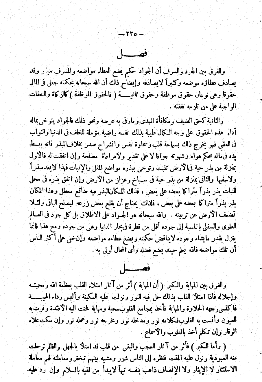 وَالثَّانيَِة كحق الضَّيْف ومكافأة المهدى وَمَا وقى بِهِ عرضه وَنَحْو ذَلِك فالجواد يتوخى بِمَالِه أَدَاء هَذِه الْحُقُوق على وَجه الْكَمَال طيبَة بذلك نَفسه راضية مؤملة للخلف فِي الدُّنْيَا وَالثَّوَاب فِي العقبى فَهُوَ يخرج ذَلِك بسماحة قلب وسخاوة نفس وانشراح صدر بِخِلَاف المبذر فَإِنَّهُ يبسط يَده فِي مَاله بِحكم هَوَاهُ وشهوته جزَافا لَا على تَقْدِير وَلَا مُرَاعَاة مصلحَة وَإِن اتّفقت لَهُ فَالْأول بِمَنْزِلَة من بذر حَبَّة فِي الأَرْض تنْبت وتوخى ببذره مَوَاضِع الْمغل والإنبات فَهَذَا لَا يعد مبذرا وَلَا سَفِيها وَالثَّانِي بِمَنْزِلَة من بذر حَبَّة فِي سباخ وعزاز من الأَرْض وَإِن اتّفق بذره فِي مَحل النَّبَات بذر بذرا متراكما بعضه على بعض فَلذَلِك الْمَكَان الْبذر فِيهِ ضائع معطل وَهَذَا الْمَكَان بذر بذرا متراكما بعضه على بعض فَلذَلِك يحْتَاج أَن يقْلع بعض زرعه ليصلح الْبَاقِي وَلِئَلَّا تضعف الأَرْض عَن تَرْبِيَته وَالله سُبْحَانَهُ هُوَ الْجواد على الْإِطْلَاق بل كل جود فِي الْعَالم الْعلوِي والسفلي بِالنِّسْبَةِ إِلَى جوده أقل من قَطْرَة فِي بحار الدُّنْيَا وَهِي من جوده وَمَعَ هَذَا فَإِنَّمَا ينزل بِقدر مَا يَشَاء وجوده لَا يُنَاقض حكمته وَيَضَع عطاءه موَاضعه وَإِن خَفِي على أَكثر النَّاس أَن تِلْكَ موَاضعه فَالله يعلم حَيْثُ يضع فَضله وَأي الْمحَال أولى بِهِ
