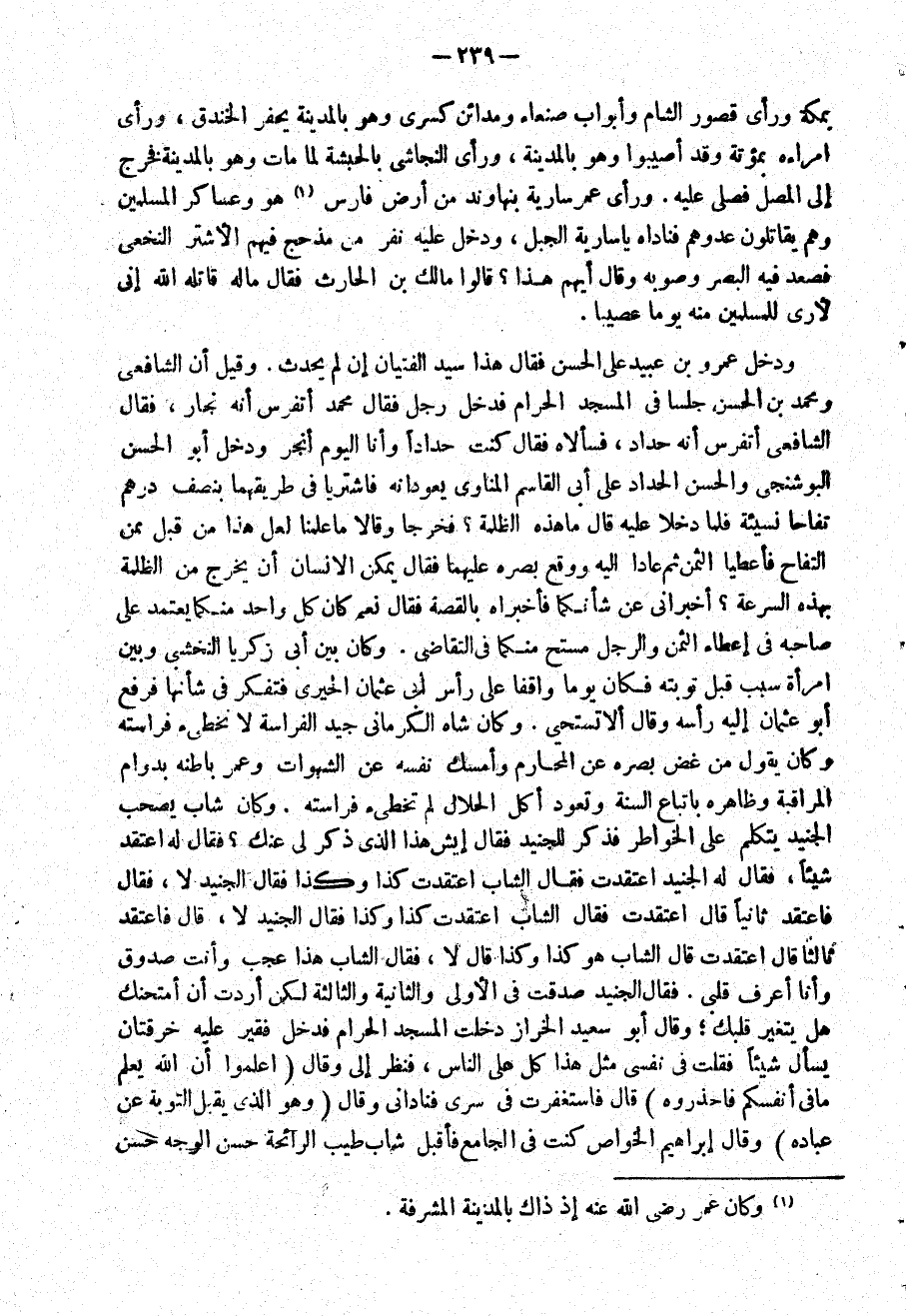 وَدخل عَمْرو بن عبيد على الْحسن فَقَالَ هَذَا سيد الفتيان إِن لم يحدث وَقيل أَن الشَّافِعِي وَمُحَمّد بن الْحسن جلسا فِي الْمَسْجِد الْحَرَام فَدخل رجل فَقَالَ مُحَمَّد أتفرس أَنه نجار فَقَالَ الشَّافِعِي أتفرس أَنه حداد فَسَأَلَاهُ فَقَالَ كنت حدادا وَأَنا الْيَوْم أنجر وَدخل أَبُو الْحسن البوشنجي وَالْحسن الْحداد على أبي الْقَاسِم المناوى يعودانه فاشتريا فِي طريقهما بِنصْف دِرْهَم تفاحا نَسِيئَة فَلَمَّا دخلا عَلَيْهِ قَالَ مَا هَذِه الظلمَة فَخَرَجَا وَقَالا مَا علمنَا لَعَلَّ هَذَا من قبل مِمَّن التفاح فأعطيا الثّمن ثمَّ عادا إِلَيْهِ وَوَقع بَصَره عَلَيْهِمَا فَقَالَ يُمكن الْإِنْسَان أَن يخرج من الظلمَة بِهَذِهِ السرعة أخبراني عَن شأنكما فَأَخْبَرَاهُ بالقصة فَقَالَ نعم كَانَ كل وَاحِد مِنْكُمَا يعْتَمد على صَاحبه فِي إِعْطَاء الثّمن وَالرجل مستح مِنْكُمَا فِي التقاضي وَكَانَ بَين زَكَرِيَّا النخشي وَبَين امْرَأَة سَبَب قبل تَوْبَته فَكَانَ يَوْمًا وَاقِفًا على رَأس أبي عُثْمَان الخيري فتفكر فِي شَأْنهَا فَرفع أَبُو عُثْمَان إِلَيْهِ رَأسه وَقَالَ أَلا تَسْتَحي وَكَانَ شاه الْكرْمَانِي جيد الفراسة لَا نخطىء فراسته وَكَانَ يَقُول من غض بَصَره عَن الْمَحَارِم وَأمْسك نَفسه عَن الشَّهَوَات وَعمر بَاطِنه بدوام المراقبة وظاهرة بإتباع السّنة وتعود أكل الْحَلَال لم تخطىء فراسته وَكَانَ شَاب يصحب الْجُنَيْد يتَكَلَّم على الخواطر فَذكر للجنيد فَقَالَ إيش هَذَا الَّذِي ذكر لي عَنْك فَقَالَ لَهُ اعْتقد شَيْئا فَقَالَ لَهُ الْجُنَيْد اعتقدت فَقَالَ الشَّاب اعتقدت كَذَا وَكَذَا فَقَالَ الْجُنَيْد لَا فَقَالَ فأعتقد ثَانِيًا قَالَ اعتقدت فَقَالَ الشَّاب اعتقدت كَذَا وَكَذَا فَقَالَ الْجُنَيْد لَا قَالَ فَاعْتقد ثَالِثا قَالَ اعتقدت قَالَ الشَّاب هُوَ كَذَا وَكَذَا قَالَ لَا فَقَالَ الشَّاب هَذَا عجب وَأَنت صَدُوق وَأَنا أعرف قلبِي فَقَالَ الْجُنَيْد صدقت فِي الأولى وَالثَّانيَِة وَالثَّالِثَة لَكِن أردْت أَن أمتحنك هَل يتَغَيَّر قَلْبك وَقَالَ أَبُو سعيد الخراز دخلت الْمَسْجِد الْحَرَام فَدخل فَقير عَلَيْهِ خرقتان يسْأَل شَيْئا فَقلت فِي نَفسِي مثل هَذَا كل على النَّاس فَنظر إِلَى وَقَالَ اعلموا أَن الله يعلم مَا فِي أَنفسكُم فَاحْذَرُوهُ قَالَ فأستغفرت فِي سري فناداني وَقَالَ {وَهُوَ الَّذِي يقبل التَّوْبَة عَن عباده} وَقَالَ إِبْرَاهِيم الْخَواص كنت فِي الْجَامِع فَأقبل شَاب طيب الرَّائِحَة حسن الْوَجْه حسن