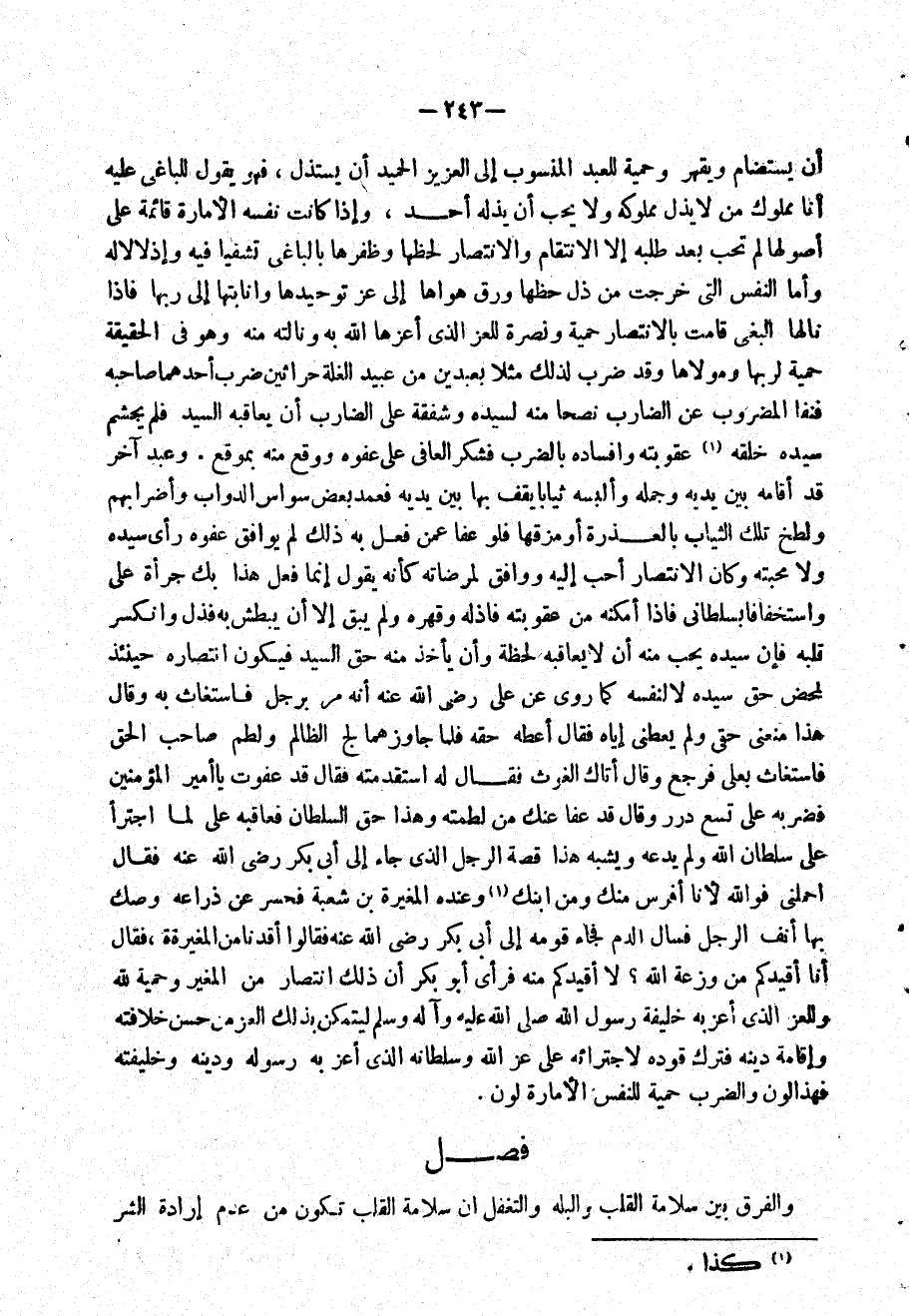 أَن يستضام ويقهر وحمية للْعَبد الْمَنْسُوب إِلَى الْعَزِيز الحميد أَن يستذل فَهُوَ يُقَال للباغي عَلَيْهِ أَنا مَمْلُوك من لَا يذل مَمْلُوكه وَلَا يحب أَن يذله أحد وَإِذا كَانَت نَفسه الأمارة قَائِمَة على أُصُولهَا لم تحب بعد طلبه إِلَّا الانتقام والانتصار لحظها وظفرها بالباغي تشفيا فِيهِ وإذلالا لَهُ وَأما النَّفس الَّتِي خرجت من ذل حظها ورق هَواهَا إِلَى عز توحيدها وإنابتها إِلَى رَبهَا فَإِذا نالها الْبَغي قَامَت بالانتصار حمية ونصرة للعز الَّذِي أعزها الله بِهِ ونالته مِنْهُ وَهُوَ فِي الْحَقِيقَة حمية لِرَبِّهَا ومولاها وَقد ضرب لذَلِك مثلا بعبدين من عبيد الْغلَّة حراثين ضرب أَحدهمَا صَاحبه فنفا الْمَضْرُوب عَن الضَّارِب نصحا مِنْهُ لسَيِّده وشفقة على الضَّارِب أَنِّي عاقبه السَّيِّد فَلم يجشم سَيّده خلقه عُقُوبَته وإفساده بِالضَّرْبِ فَشكر الْعَافِي على عَفوه وَوَقع مِنْهُ بموقع وَعبد آخر قد أَقَامَهُ بَين يَدَيْهِ وجمله وَألبسهُ ثيابًا يقف بهَا بَين يَدَيْهِ فَعمد بعض سواس الدَّوَابّ وأضرابهم ولطخ تِلْكَ الثِّيَاب بالعذرة أَو مزقها فَلَو عَفا عَمَّن فعل بِهِ ذَلِك لم يُوَافق عَفوه رأى سَيّده وَلَا محبته وَكَانَ الِانْتِصَار أحب إِلَيْهِ وَوَافَقَ لمرضاته كَأَنَّهُ يَقُول إِنَّمَا فعل هَذَا بك جرْأَة عَليّ واستخفافا بسلطاني فَإِذا أمكنه من عُقُوبَته فأذله وقهره وَلم يبْق إِلَّا أَن يبطش بِهِ فذل وانكسر قلبه فَإِن سَيّده يحب مِنْهُ أَن لَا يُعَاقِبهُ لَحْظَة وَأَن يَأْخُذ مِنْهُ حق السَّيِّد فَيكون انتصاره حِينَئِذٍ لمحض حق سَيّده لَا لنَفسِهِ كَمَا روى عَن عَليّ رَضِي الله أَنه مر بِرَجُل فاستغاث بِهِ وَقَالَ هَذَا مَنَعَنِي حَقي وَلم يُعْطِنِي إِيَّاه فَقَالَ أعْطه حَقه فَلَمَّا جاوزهما لج الظَّالِم وَلَطم صَاحب الْحق فاستغاث بعلي فَرجع وَقَالَ أَتَاك الْغَوْث فَقَالَ لَهُ استقدمته فَقَالَ قد عَفَوْت يَا أَمِير الْمُؤمنِينَ فَضَربهُ على تسع دور وَقَالَ قد عَفا عَنْك من لطمته وَهَذَا حق السُّلْطَان فعاقبه على لما اجترأ على سُلْطَان الله وَلم يَدعه وَيُشبه هَذَا قصَّة الرجل الَّذِي جَاءَ إِلَى أبي بكر رَضِي الله عَنهُ فَقَالَ احملني فوَاللَّه لَا أَنا أَفرس مِنْك وَمن ابْنك وَعِنْده الْمُغيرَة بن شُعْبَة فحسر عَن ذراعه وصك بهَا أنف الرجل فَسَالَ الدَّم فجَاء قومه إِلَى أبي بكر رَضِي الله عَنهُ فَقَالُوا أقدنا من الْمُغيرَة فَقَالَ أَنا أقيدكم من وزعة الله لَا أقيدكم مِنْهُ فَرَأى أَبُو بكر أَن ذَلِك انتصار من المغير وحمية الله وللعز الَّذِي أعز بِهِ خَليفَة رَسُول الله ليتَمَكَّن بذلك الْعِزّ من حسن خِلَافَته وَإِقَامَة دينه فَترك قوده لاجترائه على عز الله وسلطانه الَّذِي أعز بِهِ رَسُوله وَدينه وخليفته فَهَذَا لون وَالضَّرْب حمية للنَّفس الأمارة لون