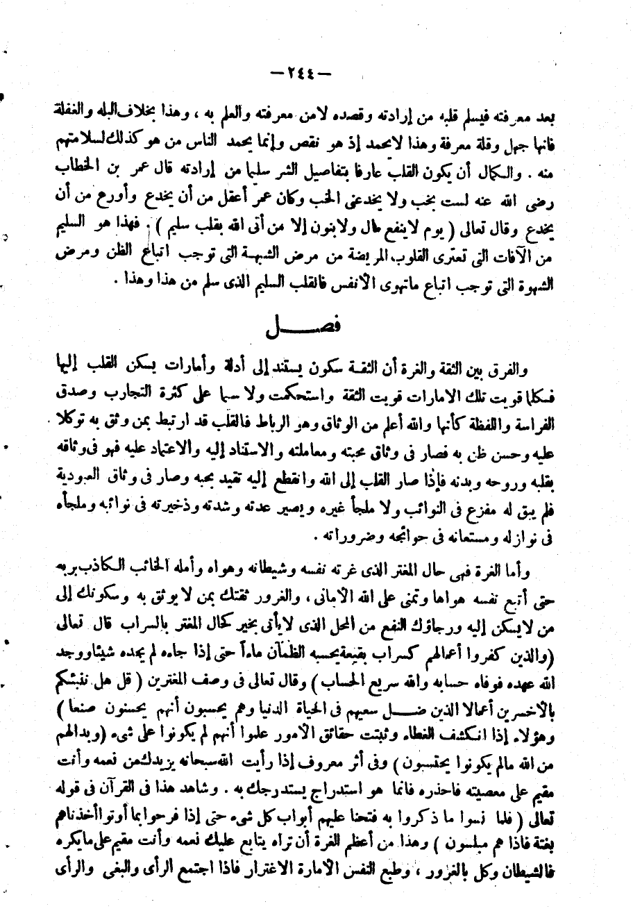 بعد مَعْرفَته فَيسلم قلبه من إِرَادَته وقصده لَا من مَعْرفَته وَالْعلم بِهِ وَهَذَا بِخِلَاف البله والغفلة فَإِنَّهَا جهل وَقلة معرفَة وَهَذَا لَا يحمد إِذْ هُوَ نقص وَإِنَّمَا يحمد النَّاس من هُوَ كَذَلِك لسلامتهم مِنْهُ والكمال أَن يكون الْقلب عَارِفًا بتفاصيل الشَّرّ سليما من إِرَادَته قَالَ عمر بن الْخطاب رَضِي الله عَنهُ لست بخب وَلَا يخدعني الخب وَكَانَ عمر أَعقل من أَن يخدع وَأَوْرَع من أَن يخدع وَقَالَ تَعَالَى {يَوْم لَا ينفع مَال وَلَا بنُون إِلَّا من أَتَى الله بقلب سليم} فَهَذَا هُوَ السَّلِيم من الْآفَات الَّتِي تعتري الْقُلُوب الْمَرِيضَة من مرض الشُّبْهَة الَّتِي توجب اتِّبَاع الظَّن وَمرض الشَّهْوَة الَّتِي توجب اتِّبَاع مَا تهوى الْأَنْفس فالقلب السَّلِيم الَّذِي سلم من هَذَا وَهَذَا