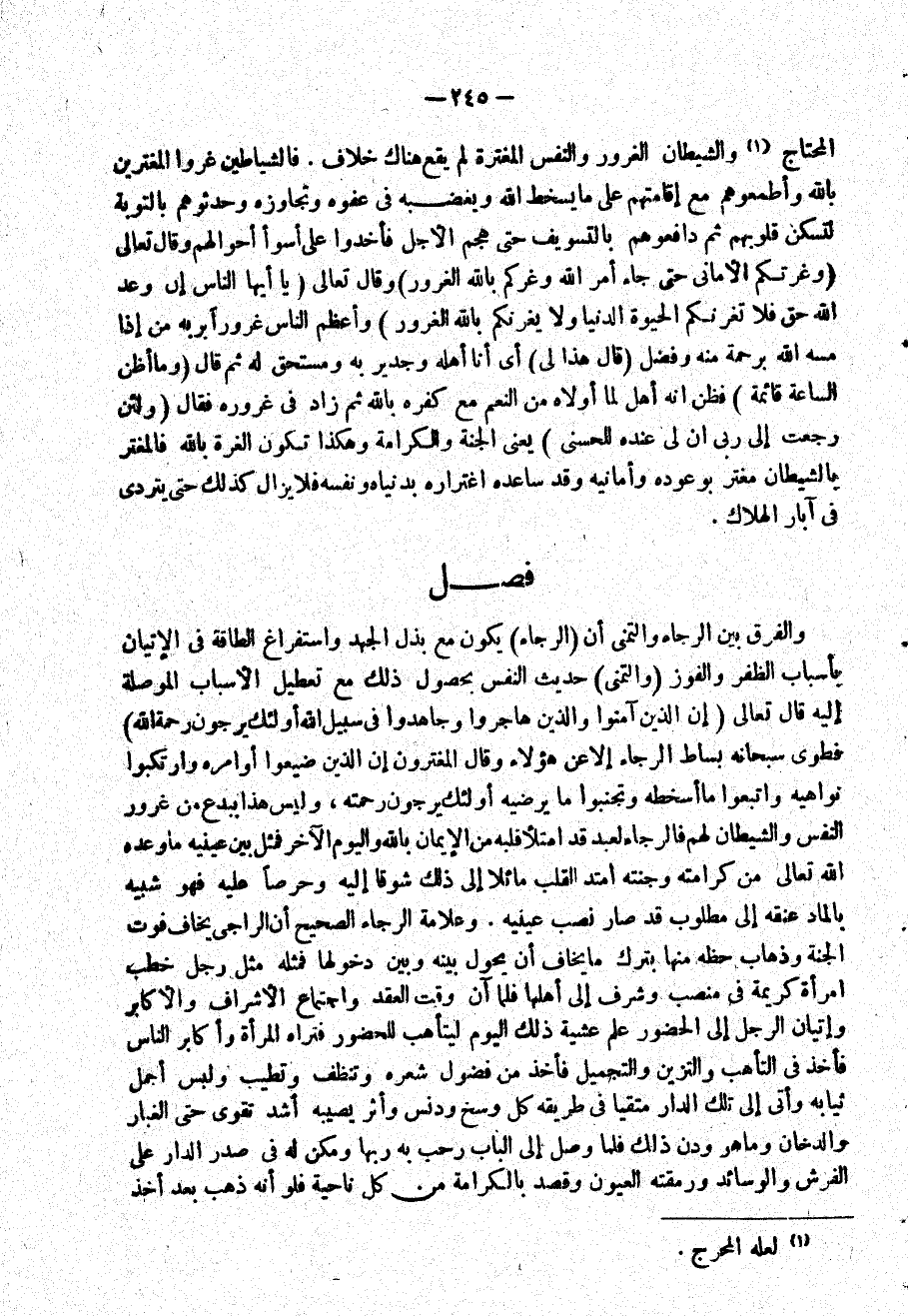 فصل وَالْفرق بَين الرَّجَاء وَالتَّمَنِّي أَن الرَّجَاء يكون مَعَ بذل الْجهد واستفراغ