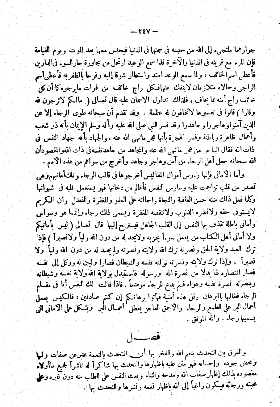 جوارهما ملتجئ إِلَى الله من حَبسه فِي سجنهما فِي الدُّنْيَا فَيحْبس مَعهَا بعد الْمَوْت وَيَوْم الْقِيَامَة فَإِن الْمَرْء مَعَ قرينه فِي الدُّنْيَا وَالْآخِرَة فَلَمَّا سمع الْوَعيد ارتحل من مجاورة جَار السوء فِي الدَّاريْنِ فَأعْطى اسْم الْخَائِف وَلما سمع الْوَعْد امْتَدَّ واستطار شوقا وفرحا بالظفر بِهِ فَأعْطى اسْم الراجي وحالاه متلازمان لَا يَنْفَكّ عَنْهُمَا فَكل راج خَائِف من فَوَات مَا يرجوه كَمَا أَن كل خَائِف راج أَمنه مِمَّا يخَاف فَلذَلِك تداول الاسمان عَلَيْهِ قَالَ تَعَالَى {مَا لكم لَا ترجون لله وقارا} قَالُوا فِي تَفْسِيرهَا لَا تخافون لله عَظمَة وَقد تقدم أَن سُبْحَانَهُ طوى الرَّجَاء إِلَّا عَن الَّذين آمنُوا وَهَاجرُوا وَجَاهدُوا وَقد فسر النَّبِي الْإِيمَان بِأَنَّهُ ذُو شعب وأعمال ظَاهِرَة وباطنة وَفسّر الْهِجْرَة بِأَنَّهَا هجر مَا نهى الله عَنهُ وَالْجهَاد بِأَنَّهُ جِهَاد النَّفس فِي ذَات الله فَقَالَ الْمُهَاجِرين من هجر مَا نهى الله عَنهُ والمجاهد من جَاهد نَفسه فِي ذَات الله وَالْمَقْصُود بِأَن الله سُبْحَانَهُ جعل أهل الرَّجَاء من آمن وَهَاجَر وجاهد وَأخرج من سواهُم من هَذِه الْأُمَم
