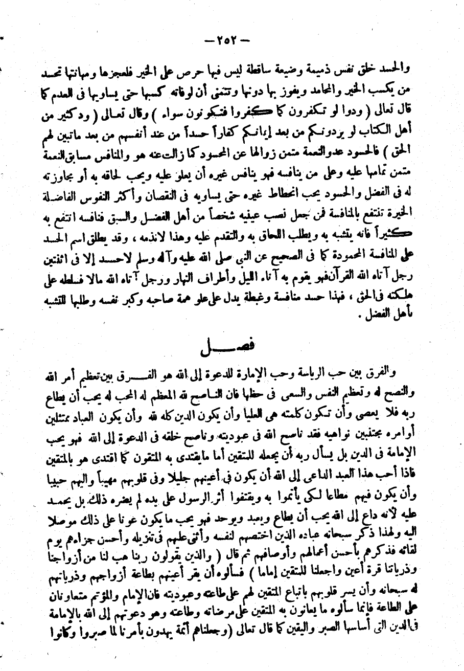 والحسد خلق نفس ذميمة وضيعه سَاقِطَة لَيْسَ فِيهَا حرص على الْخَيْر فلعجزها ومهانتها تحسد من يكْسب الْخَيْر والمحامد ويفوز بهَا دونهَا وتتمنى أَن لوفاته كسبها حَتَّى يساويها فِي الْعَدَم كَمَا قَالَ تَعَالَى ودوا لَو تكفرون كَمَا كفرُوا فتكونون سَوَاء وَقَالَ تَعَالَى ود كثير من أهل الْكتاب لَو يردونكم من بعد إيمَانكُمْ كفَّارًا حسدا من عِنْد أنفسهم من بعد مَا تبين لَهُم الْحق فالحسود عَدو النِّعْمَة متمن زَوَالهَا عَن الْمَحْسُود كَمَا زَالَت عَنهُ هُوَ والمنافس مسابق النِّعْمَة متمن تَمامهَا عَلَيْهِ وعَلى من ينافسه فَهُوَ ينافس غَيره أَن يَعْلُو عَلَيْهِ وَيُحب لحاقه بِهِ أَو مجاوزته لَهُ فِي الْفضل والحسود يحب انحطاط غَيره حَتَّى يُسَاوِيه فِي النُّقْصَان وَأكْثر النُّفُوس الفاضلة الْخيرَة تنْتَفع بالمنافسة فَمن جعل نصب عَيْنَيْهِ شخصا من أهل الْفضل والسبق فنافسه انْتفع بِهِ كثيرا فَإِنَّهُ يتشبه بِهِ وَيطْلب اللحاق بِهِ والتقدم عَلَيْهِ وَهَذَا لَا نذمه وَقد يُطلق اسْم الْحَسَد على المنافسة المحمودة كَمَا فِي الصَّحِيح عَن النَّبِي لَا حسد إِلَّا فِي اثْنَتَيْنِ رجل آتَاهُ الله الْقُرْآن فَهُوَ يقوم بِهِ أناء اللَّيْل وأطراف النَّهَار وَرجل آتَاهُ الله مَالا فَسَلَّطَهُ على هَلَكته فِي الْحق فَهَذَا حسد مُنَافَسَة وغبطة يدل على علو همة صَاحبه وَكبر نَفسه وطلبها للتشبه بِأَهْل الْفضل
