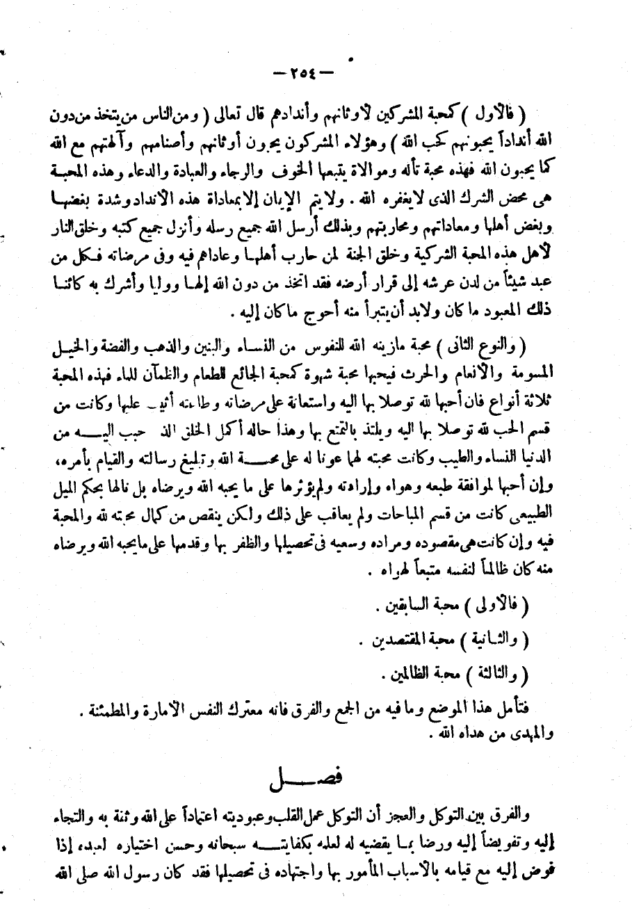 وَالنَّوْع الثَّانِي محبَّة مَا زينه الله للنفوس من النِّسَاء والبنين وَالذَّهَب وَالْفِضَّة وَالْخَيْل المسومة والأنعام والحرث فيحبها محبَّة شَهْوَة كمحبة الجائع للطعام والظمآن للْمَاء فَهَذِهِ الْمحبَّة ثَلَاثَة أَنْوَاع فَإِن أحبها لله توصلا بهَا إِلَيْهِ واستعانة على مرضاته وطاعته أثيب عَلَيْهَا وَكَانَت من قسم الْحبّ لله توصلا بهَا إِلَيْهِ ويلتذ بالتمتع بهَا وَهَذَا حَاله أكمل الْخلق الَّذِي حبب إِلَيْهِ من الدُّنْيَا النِّسَاء وَالطّيب وَكَانَت محبته لَهما عونا لَهُ على محبَّة الله وتبليغ رسَالَته وَالْقِيَام بأَمْره وَإِن أحبها لموافقة طبعه وهواه وإرادته وَلم يؤثرها على مَا يُحِبهُ الله ويرضاه بل نالها بِحكم الْميل الطبيعي كَانَت من قسم الْمُبَاحَات وَلم يُعَاقب على ذَلِك وَلَكِن ينقص من كَمَال محبته لله والمحبة فِيهِ وَإِن كَانَت هِيَ مَقْصُودَة وَمرَاده وسعيه فِي تَحْصِيلهَا وَالظفر بهَا وقدمها على مَا يُحِبهُ الله ويرضاه مِنْهُ كَانَ ظَالِما لنَفسِهِ مُتبعا لهواه