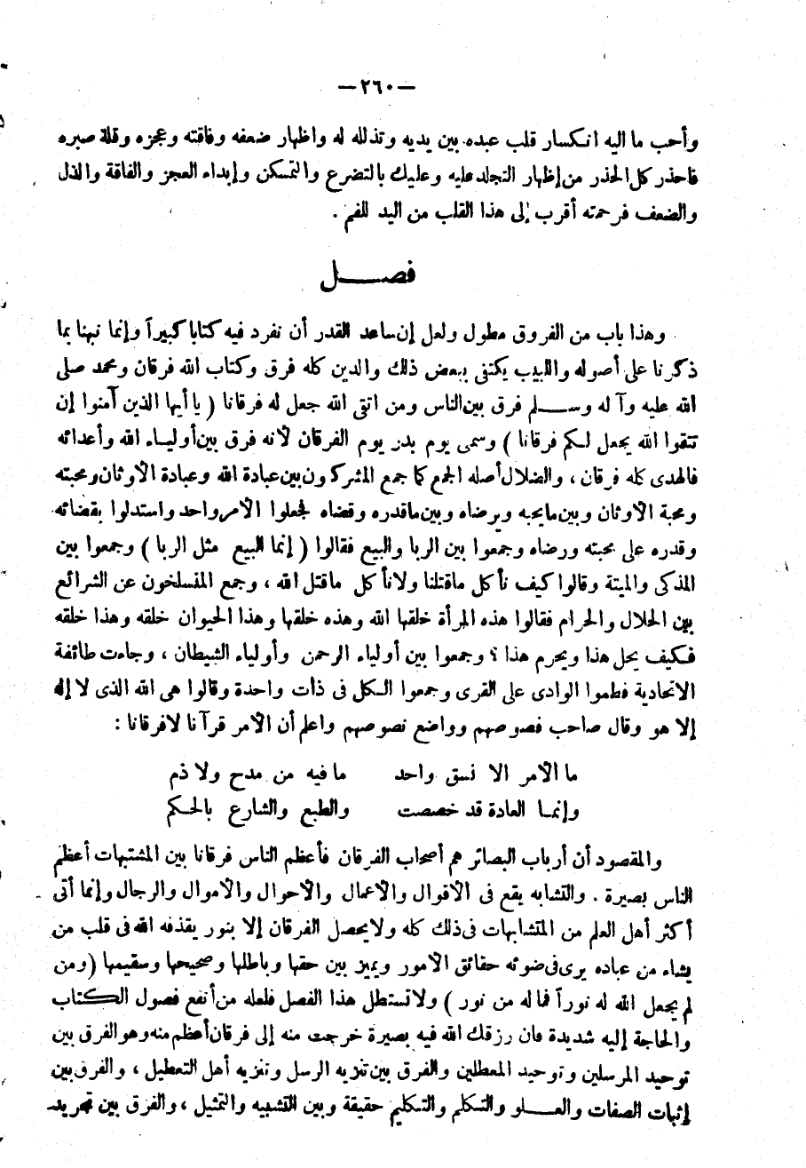 كتابا كَبِيرا وَإِنَّمَا نبهنا بِمَا ذكرنَا على أُصُوله واللبيب يَكْتَفِي بِبَعْض ذَلِك وَالدّين كُله فرق وَكتاب الله فرقان وَمُحَمّد فرق بَين النَّاس وَمن اتَّقى الله جعل لَهُ فرقانا يَا أَيهَا الَّذين آمنُوا إِن تتقوا الله يَجْعَل لكم فرقانا وسمى يَوْم بدر يَوْم الْفرْقَان لِأَنَّهُ فرق بَين أَوْلِيَاء الله وأعدائه فالهدى كُله فرقان والضلال أَصله الْجمع كَمَا جمع الْمُشْركُونَ بَين عبَادَة الله وَعبادَة الْأَوْثَان ومحبته ومحبة الْأَوْثَان وَبَين مَا يُحِبهُ ويرضاه وَبَين مَا قدره وقضاه فَجعلُوا الْأَمر وَاحِد وَاسْتَدَلُّوا بِقَضَائِهِ وَقدره على محبته وَرضَاهُ وجمعوا بَين الرِّبَا وَالْبيع فَقَالُوا إِنَّمَا البيع مثل الرِّبَا وجمعوا بَين المذكي وَالْميتَة وَقَالُوا كَيفَ نَأْكُل مَا قتلنَا وَلَا نَأْكُل مَا قتل الله وَجمع المنسلخون عَن الشَّرَائِع بَين الْحَلَال وَالْحرَام فَقَالُوا هَذِه الْمَرْأَة خلقهَا الله وَهَذِه خلقهَا وَهَذَا الْحَيَوَان خلقه وَهَذَا خلقه فَكيف يحل هَذَا وَيحرم هَذَا وجمعوا بَين أَوْلِيَاء الرَّحْمَن وأولياء الشَّيْطَان وَجَاءَت طَائِفَة الاتحادية فطموا الْوَادي على الْقرى وجمعوا الْكل فِي ذَات وَاحِدَة وَقَالُوا هِيَ الله الَّذِي لَا إِلَه إِلَّا هُوَ وَقَالَ صَاحب فصوصهم وَوَاضِع نصوصهم وَاعْلَم أَن الْأَمر قُرْآنًا لَا فرقانا