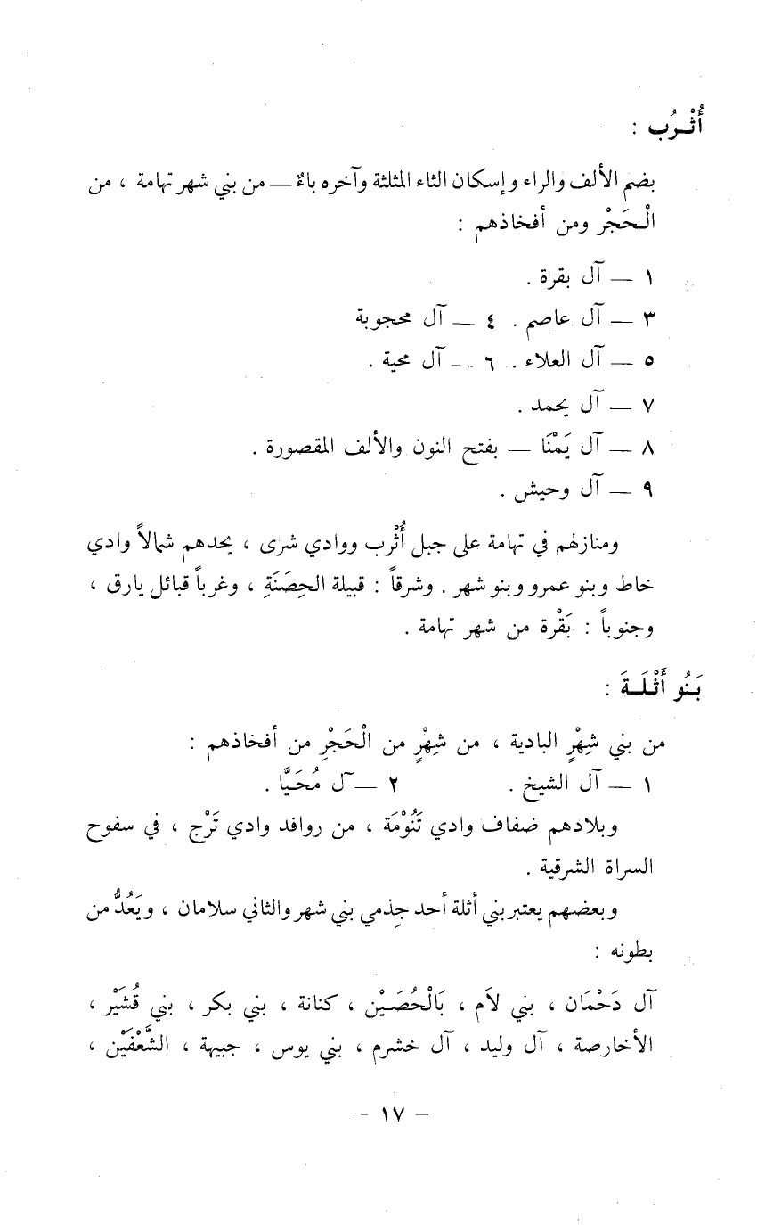 أُثْرُب: بضم الألف والراء وإسكان الثاء المثلثة وآخره باء - من بني شِهْرِ تهامة، من الحَجْر ومن أفخاذهم: 1 - آل بقرة.